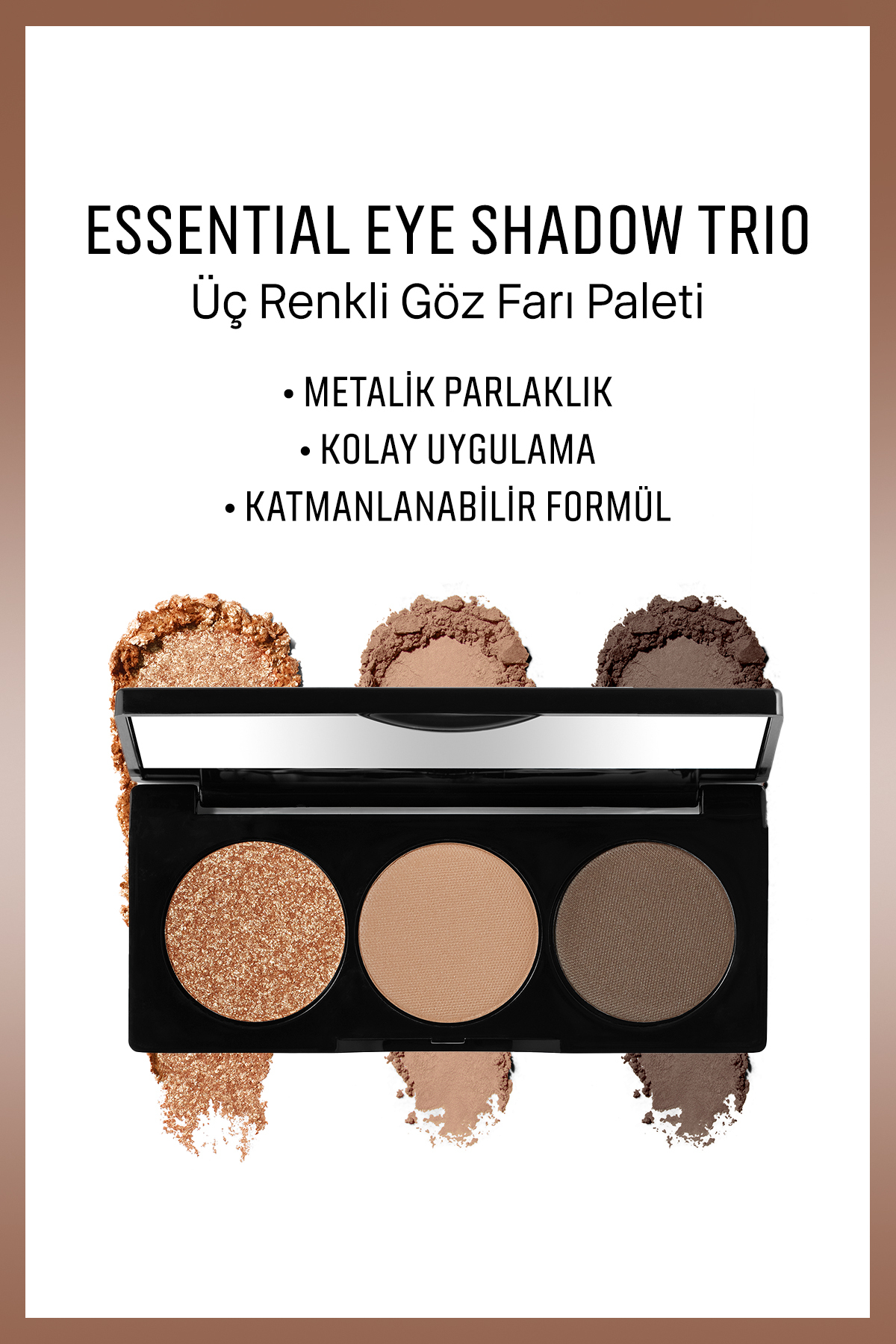 Created with 3 different matte and metallic color tones carefully selected by makeup artists, this eyeshadow palette accentuates the eyes and completes your look from day to night.