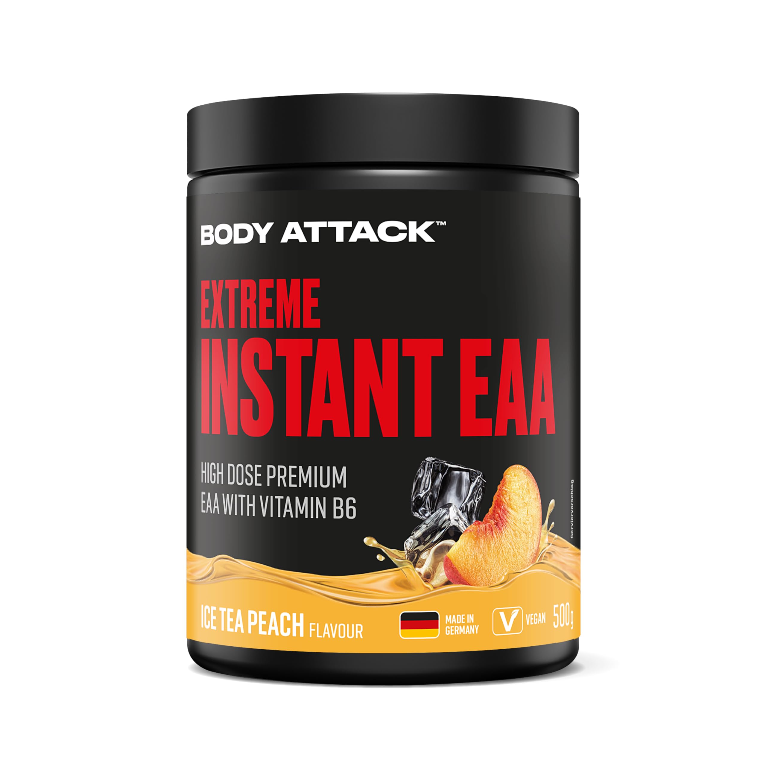 Body Attack's Extreme Instant EAA (500g) is a concentrated source of essential amino acids to help you push your limits, improve recovery, and preserve muscle mass, even after the most intense workouts (weight training, cross-training, fitness, etc.). Each serving provides 9,461 mg of EAAs, including the renowned BCAAs (leucine, isoleucine, valine), essential for protein synthesis and combating muscle breakdown. Your body doesn't produce them, so you might as well give it the best. Enriched with vitamin B6, this formula supports your energy metabolism, improves amino acid absorption, and helps reduce fatigue. Its ultra-fine powder dissolves instantly, without lumps or heaviness, for rapid absorption and optimal effectiveness from the very first serving. Whether you're bulking, cutting, or simply looking to improve your performance, Extreme Instant EAA is your ally for progress, faster recovery, and staying at your peak. Choose from 3 refreshing flavors: Cola, Peach Iced Tea, and Lemon. INGREDIENTS Cola Ingredients: L-Leucine 17.6 , Citric Acid, L-Lysine Hydrochloride 13.4 , L-Isoleucine 8.8 , L-Valine 8.8 , L-Phenylalanine 7.1 , L-Methionine 6.4 , L-Threonine 6.4 , Maltodextrin, Flavoring, Ammonia Caramel, L-Tryptophan 1.7 , Sweeteners: Acesulfame K, Sucralose, Anti-caking Agent: Silicon Dioxide, Vegetable Oil: Coconut, Palm, Emulsifier: Lecithins , Vitamin B6. Sunflower Oil Ingredients Lemon: L-Leucine 17.6 , Acidifier: Citric Acid, L-Lysine Hydrochloride 13.4 , Maltodextrin, L-Isoleucine 8.8 , L-Valine 8.8 , L-Phenylalanine 7.1 , L-Methionine 6.4 , L-Threonine 6.4 , Flavoring, L-Tryptophan 1.7 , Sweeteners: Acesulfame K, Sucralose, Flavoring, Anti-caking Agent: Silicon Dioxide, Vegetable Oil: Coconut, Palm, Emulsifier: Lecithins , Vitamin B6, Color: Copper Complexes of Chlorophylls and Chlorophyllins, Carotene. Sunflower Oil Ingredients Iced Tea Peach: L-Leucine 17.6 , Acidifier: Citric AcidIdeal for strength and fitness athletes. With BCAAs. With vitamin B6.Body Attack Nutrition - Extreme Instant Eaa (500g) - EAA - 9 461 mg d'EAA - Ice Tea PêcheDESCRIPTION DU PRODUIT DESCRIPTION DU PRODUIT Extreme Instant EAA (500g) de Body Attack, c'est un concentré d'acides aminés essentiels pour t'aider à repousser tes limites, améliorer ta récupération et préserver ta masse musculaire, même après les entraînements les plus intenses (muscu, cross-training, fitness.). Chaque portion t'apporte 9 461 mg d'EAA, dont les fameux BCAA (leucine, isoleucine, valine), indispensables à la synthèse des protéines et à la lutte contre le catabolisme musculaire. Ton corps ne les fabrique pas, alors autant lui offrir le meilleur. Enrichie en vitamine B6, cette formule soutient ton métabolisme énergétique, améliore l'assimilation des acides aminés et t'aide à réduire la fatigue. Sa poudre ultra-fine se dilue instantanément, sans grumeaux ni lourdeurs, pour une absorption rapide et une efficacité optimale dès la première prise. Que tu sois en prise de masse, en sèche ou simplement en quête de performances, Extreme Instant EAA est ton allié pour progresser, récupérer plus vite et rester à ton top niveau. 3 saveurs rafraîchissantes au choix : Cola, Ice Tea Pêche, Citron. INGRÉDIENTS Ingrédients Cola : L-Leucine 17,6 , Acidifiant Acide citrique, Chlorhydrate de L-Lysine 13,4 , L-Isoleucine 8,8 , L-Valine 8,8 , L-Phénylalanine 7,1 , L-Méthionine 6,4 , L-Thréonine 6,4 , Maltodextrine, Arôme, Colorant Caramel à l'ammoniaque, L-Tryptophane 1,7 , Édulcorants Acésulfame K, Sucralose, Agent de séparation Dioxyde de silicium, Huile végétale Noix de coco, Palme, Émulsifiant Lécithines , Vitamine B6. de tournesolIngrédients Citron : L-Leucine 17,6 , Acidifiant Acide citrique, Chlorhydrate de L-Lysine 13,4 , Maltodextrine, L-Isoleucine 8,8 , L-Valine 8,8 , L-Phénylalanine 7,1 , L-Méthionine 6,4 , L-Thréonine 6,4 , Arôme, L-Tryptophane 1,7 , Édulcorants Acésulfame K, Sucralose, Arôme, Agent de séparation Dioxyde de silicium, Huile végétale Noix de coco, Palme, Émulsifiant Lécithines , Vitamine B6, Colorant Complexes cuivriques de chlorophylles et de chlorophyllines, Carotène. de tournesolIngrédients Ice Tea Pêche : L-Leucine 17,6 , Acidifiant : Acide citriqIdéal pour les athlètes de force et de fitness. Avec des BCAA. Avec de la vitamine B6.