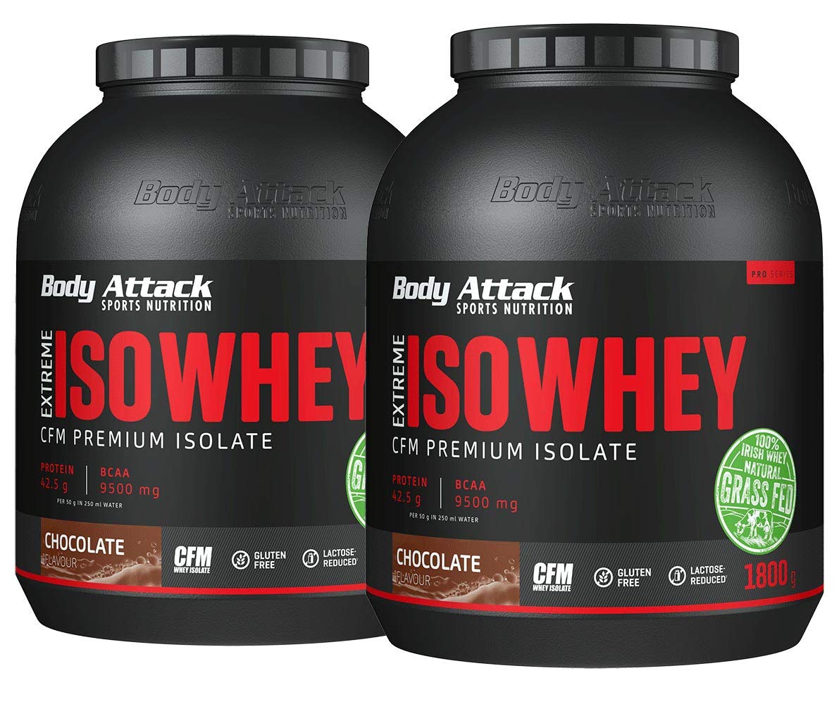 Body Attack Extreme ISO Whey Chocolate 2 x 1.8 kg - CFM Whey protein isolate from 100% Irish pasture milk gluten -free rich in EAAS perfectly soluble low in fat without aspartame 90.6% isolate content chocolate 1.8 kg (2 pack)