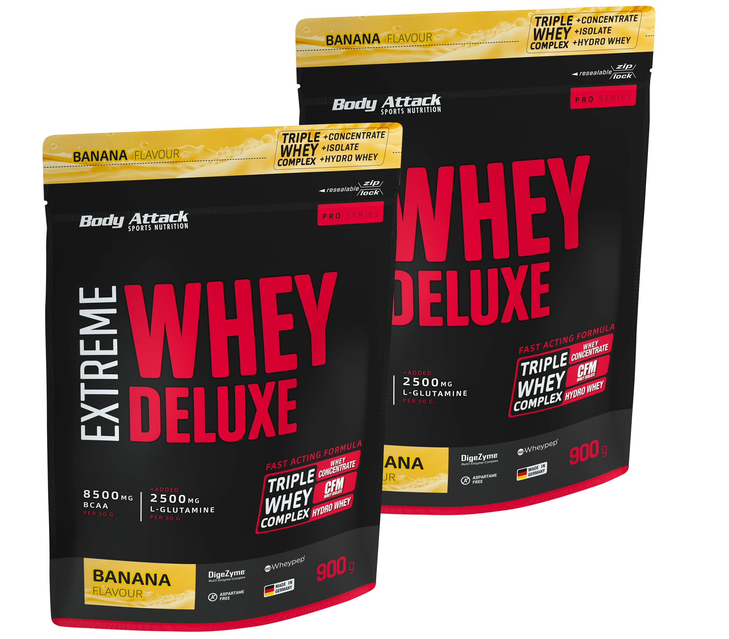 Body Attack Extreme Whey Deluxe Banana Cream 2x900g-protein powder with amino acids triple whey complex CFM whey isolates perfectly soluble protein powder low in fat sugar arm in Germany 900 g (2 Pack)