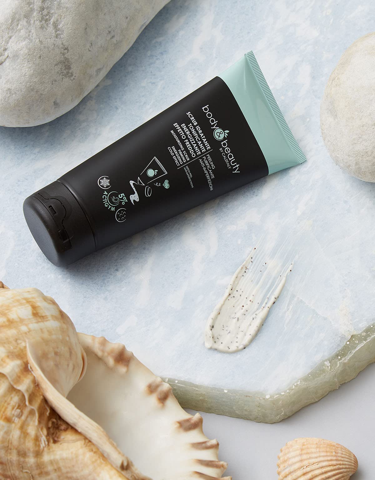 MOISTURIZING SCULPTING SCRUB – COOLING EFFECT Sold in a 200ml bottle, this moisturizing and toning scrub with a cooling effect is recommended for the warmer months as it leaves a noticeably refreshing sensation. This scrub is suitable for use as an anti-blemish peel and has an energizing effect. Its main active ingredient, Actigym (Bacillus Soybean Ferment Extract), is a marine-derived element obtained from a microorganism originating in Bermuda. It shapes and tones the silhouette, improving muscle tone associated with physical activity. Intensive slimming and firming action. RESULTS: 1. Exfoliating action 2. Firm, velvety, and revitalized skin 3. Intensive hydration 4. Stimulates microcirculation in the skin 5. Cooling effect. DIRECTIONS FOR USE: Topical (external) use. The body scrub can be applied to dry skin for a gentler action and to damp skin for a gentler action. Massage gently. For best results, first use linear movements, then wavy movements, and finally circular movements, until fully absorbed, without rubbing too hard. After approximately 5 minutes, rinse your skin with lukewarm water you will feel a cooling effect. For best results, wear Calzitaly textile cosmetics for 4-5 minutes after application. SAFETY WARNING: It is recommended to test the product on a small area of the body before full use as directed above. • Depending on individual skin sensitivity, a cooling sensation may be felt 30 minutes after application, accompanied by a slight tingling and the possible appearance of temporary redness. • The presence and intensity of these potential reactions are gradual and generally disappear 15 to 30 minutes after application. • Wash your hands after application. • Do not apply to particularly sensitive, irritated, or damaged skin (wounds, abrasions, bruises, etc.). • Not for use by pregnant women. • Do not sunbathe after application. • This product is not recommended for people with fragile hair. • Avoid contact with eyes and mucous membranes. • Keep out of reach of children.Read the instructions carefully for correct application. MENTHA PIPERITA Refreshing action, it promotes microcirculation and good venous return RESULTS: 1. EXFOLIATING action 2. COMPACT, VELVETY and REVITALIZED skin 3. Intensive HYDRATION 4. STIMULATES microcirculation 5. COOLING effect. ACTIVE INGREDIENTS: PRUNUS AMYGDALUS DULCIS Emollient, softening, nourishing and soothing properties for the skin PRUNUS ARMENIACA Exfoliating action, eliminates dead cells. It contains vitamin E and vitamin A. Its main active ingredient, ACTIGYM, an element of marine origin, shapes and tones the silhouette, improving muscle tone associated with physical activity. Intensive slimming and firming action. SCULPTING MOISTURIZING SCRUB – COOLING EFFECT This 200ml moisturizing and toning scrub with a STRONG COOLING EFFECT is indicated for a slimming and firming action and stimulates microcirculation at the skin level.Traitement Amincissant Intensif Sculptant Raffermissant Effet Froid (Gommage - 200 ml)DESCRIPTION DU PRODUIT DESCRIPTION DU PRODUIT GOMMAGE SCULPTANT HYDRATANT – EFFET FROID Vendu en flacon de 200 ml, l'utilisation de ce gommage hydratant et tonifiant à effet froid est recommandée pour la saison chaude car il laisse une sensation de fraîcheur assez marquée. Ce gommage convient au peeling anti-imperfections et a un effet énergisant. Son principe actif principale, Actigym (Bacillus Soybean Ferment Extrait), c'est un élément d'origine marine, obtenue à partir d'un micro-organisme qui dérive des Bermudes. Il forme et tonifie la silhouette, en améliorant le ton musculaire associé à l'activité phisique. Action amincissante et raffermissante intensive RESULTATS: 1. Action EXFOLIANTE 2. Peau COMPACTE, VELOUTEE et REVIGOREE 3. HYDRATATION intensive 4. STIMULE la microcirculation au niveau de la peau 5. Effet FROID CONSEILS ET MODE D'EMPLOI Usage topique (externe). Le gommage corporel peut être appliqué sur la peau sèche pour une action moins délicate et sur peau humide pour une action plus délicate. Massez doucement, pour plus d'efficacité, effectuez d'abord des mouvements linéaires, puis ondulés et enfin circulaires, jusqu'à absorption complète, sans frotter trop fort. Après environ 5 minutes, rincez la peau à l'eau tiède, tu sentiras un effet froid. Pour de meilleures résultats portez les produits cosmétiques textiles de Calzitaly 4 5 minutes après l'application AVERTISSEMENT DE SÉCURITÉ C'est recommandé de tester le produit sur une petite partie du corps avant son utilisation complète selon les instructions ci-dessus. • En fonction de la sensibilité cutanée individuelle, une sensation de froid peut être ressentie après 1 2 minutes après l'application,accompagnée d'un léger picotement avec la possible apparition de rougeurs passagères. • La présence et l'intensité de ces éventuelles réactions sont progressives, elles disparaissent généralement 15 à 30 minutes après l'application. • Lavez-vous les mains après l'application. • Ne pas appliquer sur une peau particulièrement sensible, irritée ou abîmée (plaies, écorchures, ecchymoses, etc.). • Usage interdit aux femmes enceintes. • Ne pas prendre le soleil après l'application. • Produit déconseillé aux personnes souffrant de fragilité capillaire. • Évitez tout contact avec les yeux et les muqueuses. • Tenir hors de portée des enfants.Lire attentivement la notice pour une application correcte. MENTHA PIPERITA Action rafraîchissante, elle favorise la micro circulation et le bon retour veineux RESULTATS: 1. Action EXFOLIANTE 2. Peau COMPACTE, VELOUTEE et REVIGOREE 3. HYDRATATION intensive 4. STIMULE la microcirculation 5. Effet FROID. PRINCIPES ACTIFS: PRUNUS AMYGDALUS DULCIS Propriétés émollientes, adoucissantes, nourrissantes et apaisantes pour la peau PRUNUS ARMENIACA Action exfoliante, élimine les cellules mortes. Il contient de la vitamine E et de la vitamine A. Son