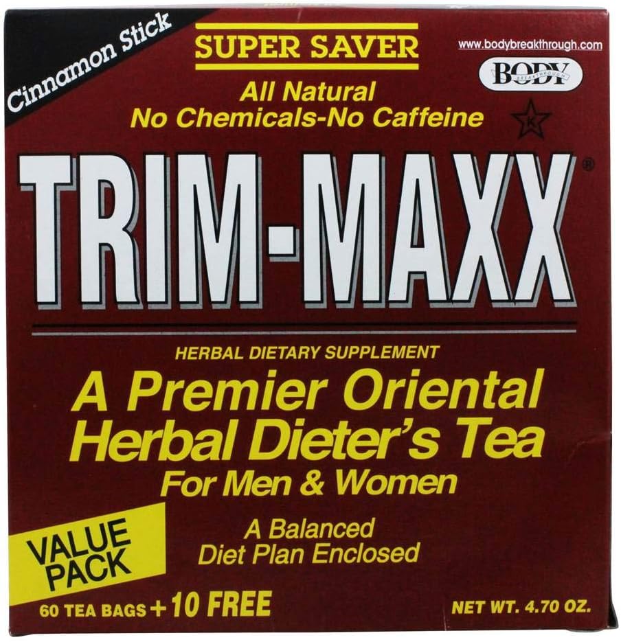 • Body Breakthrough Trim-Maxx Herbal Dieter's Tea Cinnamon Stick. Description: A Premier Oriental Herbal Dieter's Tea for Men and Women. Super Saver. All Natural. No Chemicals - No Caffeine. A Balanced Diet Plan Enclosed. Hints for Good Health. Eat natural fruits, vegetables and whole grains. Decrease high calorie foods, sugar fats, and salt content. Exercise regularly. Include some fiber into your diet. Reminder: The increased bowel movements during the first week after drinking Trim-Maxx is a natural cleansing action resulting in the body releasing excess toxins and unwanted gas pockets. Free of Caffeine and chemicals. Disclaimer These statements have not been evaluated by the FDA. These products are not intended to diagnose, treat, cure, or prevent any disease.