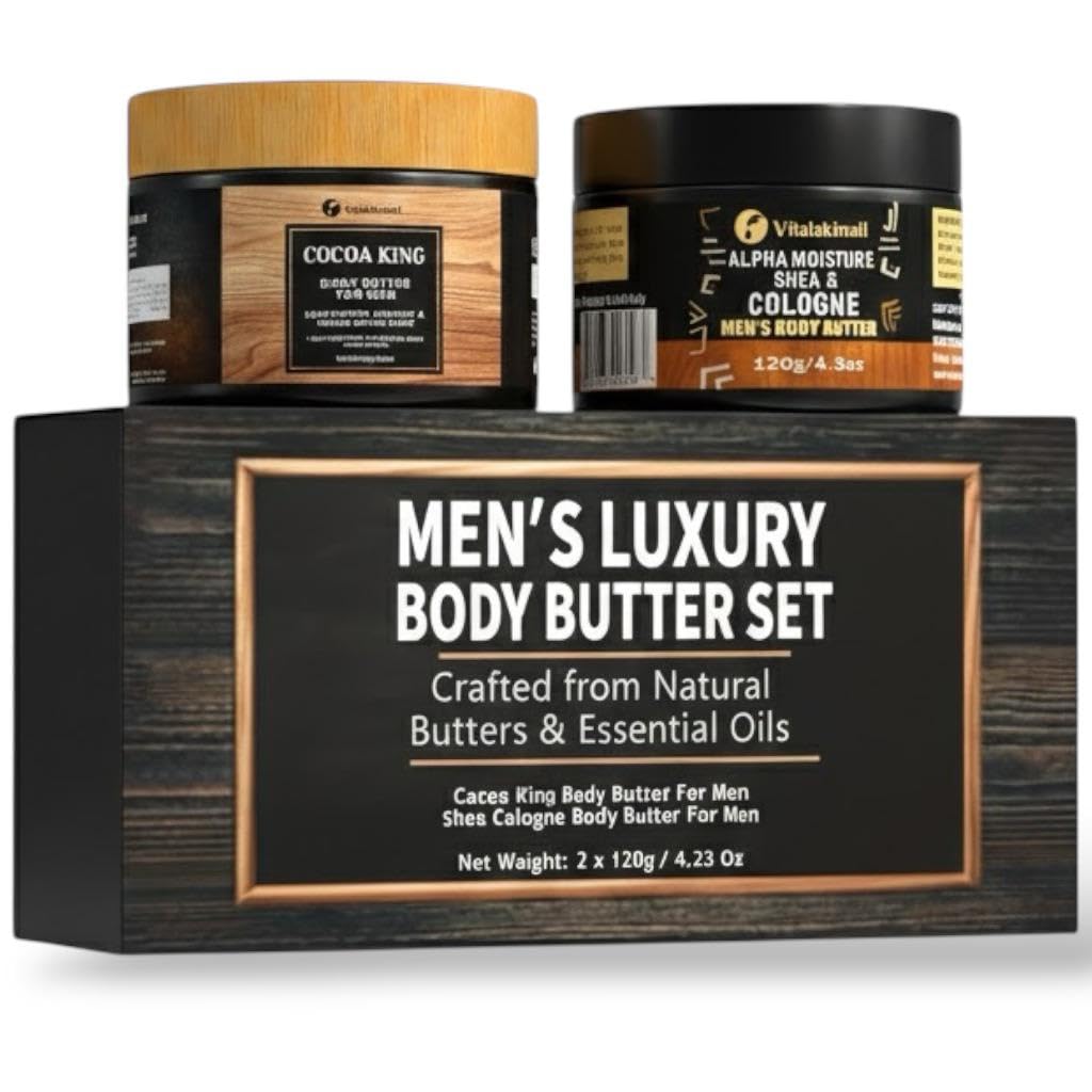 Both scents are designed to be noticeable without overpowering, enhancing your presence without clashing with cologne or other grooming products. The fragrances linger subtly on the skin, providing a fresh, confident finish that lasts throughout the day. Whether you prefer something clean and polished or warm and bold, this duo gives you versatile options in one set. This body butter duo offers two distinct, confident scent profiles so you can match your fragrance to your mood or occasion. Shea Cologne delivers a clean, smooth, cologne-inspired aroma that feels refined, modern, and masculine, ideal for workdays, evenings out, or everyday wear. Cocoa King features a warm, rich cocoa scent with deep, bold undertones that feel comforting yet powerful, perfect for colder months or relaxed settings. Designed specifically with men's skin needs in mind, this duo works well on commonly dry areas such as hands, elbows, knees, feet, arms, legs, and shoulders. With consistent use, skin feels smoother, healthier, and more comfortable throughout the day. This set is perfect for men who want effective skincare that works hard without unnecessary complexity, just clean, dependable moisture that lasts. This men's body butter duo is crafted to deliver powerful, long-lasting hydration for dry, rough, and tired skin. Made with rich shea butter and cocoa butter, each formula melts into the skin to deeply moisturize without leaving behind a greasy or sticky residue. Whether your skin is exposed to cold weather, heat, daily showers, or long workdays, this body butter helps restore softness and comfort from the first application.