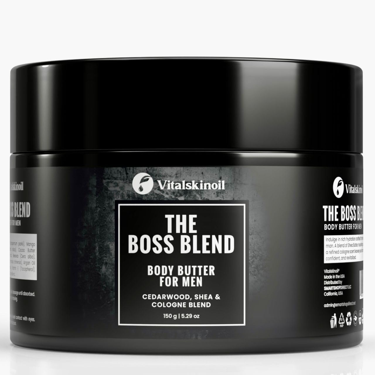 CONVENIENT PACKAGING: Comes in a sleek jar with an easy-to-use design, making application smooth and mess-free. VERSATILE USE: Perfect for daily skincare routine, suitable for all skin types and delivers optimal results for body moisturizing. NATURAL INGREDIENTS: Carefully selected natural components work together to deliver deep moisturizing benefits while maintaining skin health. 24-HOUR HYDRATION: Advanced moisturizing formula provides all-day skin hydration and nourishment, keeping skin soft and comfortable. PREMIUM BLEND: Luxurious body butter featuring Shea butter, mango butter and cologne blend for a sophisticated masculine scent and ultimate skin nourishment.