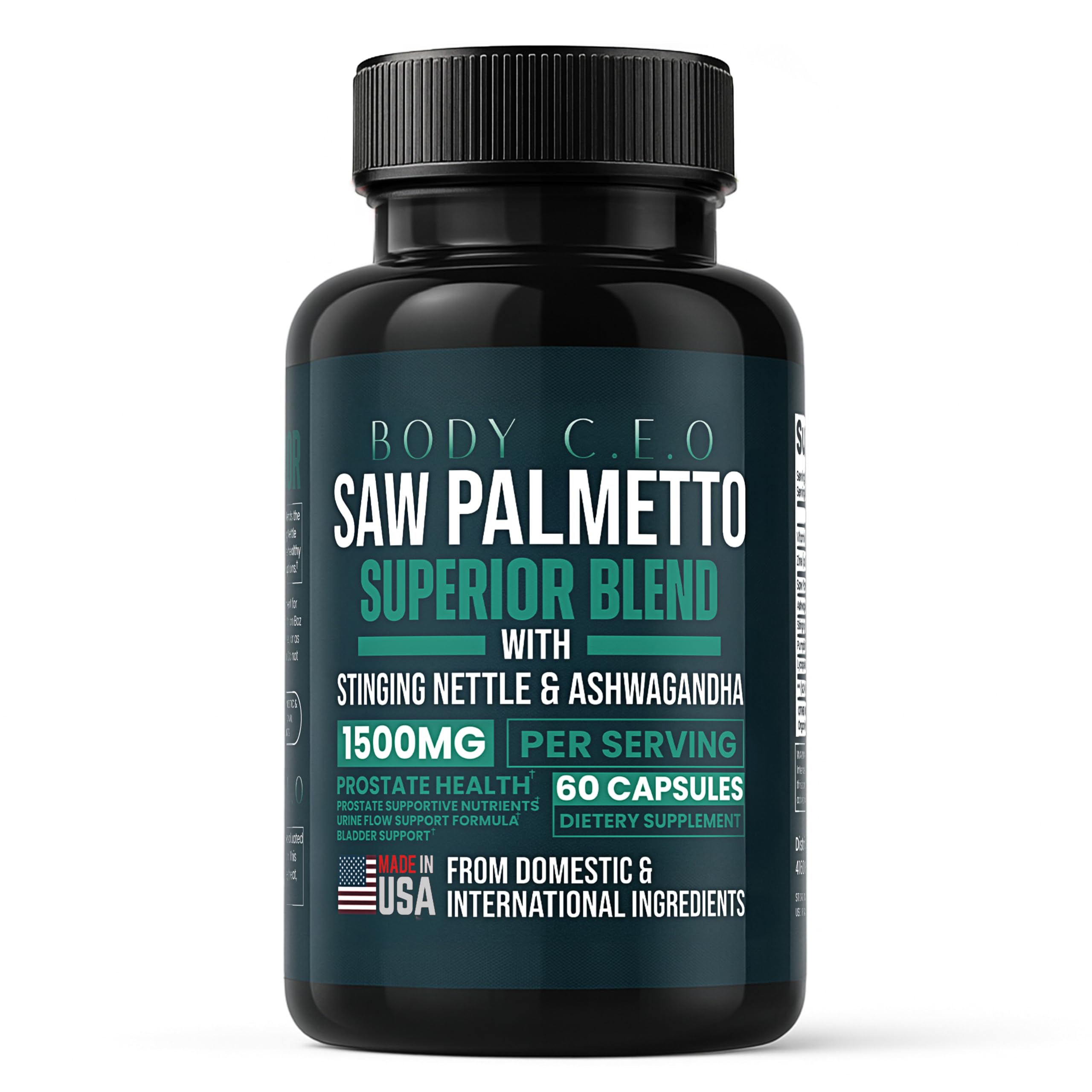 - : We're committed to your satisfaction. If you're not fully satisfied with the results of our Saw Palmetto Prostate Supplement, simply contact us for a full refund within 60 days. Zero risk, just results. Try it today and experience prostate health the natural way. : Saw Palmetto and Lycopene, along with other carefully chosen ingredients, work together to support healthy prostate and bladder function. Many users report a decrease in frequent nighttime bathroom visits, leading to more comfortable, uninterrupted sleep. Packed with key nutrients. : Formulated with Ashwagandha, this supplement supports not only prostate health but also promotes restful sleep, helping reduce interruptions during the night. Maintain your energy, focus, and vitality throughout the day while supporting prostate wellness. Feel your best, every day. : Help maintain healthy urine flow and bladder function with a unique combination of Saw Palmetto, Stinging Nettle, and Pumpkin Seed Powder. This natural blend encourages healthy bladder function and may reduce the frequency of bathroom visits. Supports overall urinary health. : Maintain normal prostate function with BODY C.E.O. Saw Palmetto Premium Blend. This powerful formula includes Saw Palmetto, Ashwagandha, Lycopene, and Zinc to help support overall prostate health and wellness. Promote vitality and support urinary function without fillers. 60 capsules per bottle.