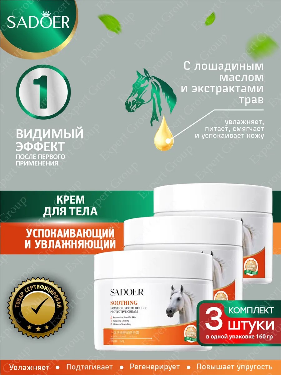 Успокаивающий и увлажняющий крем для тела Sadoer с лошадиным маслом и травами 160 гр х 3 шт. Обогащённый уникальной формулой крем сочетает в себе целебные свойства натуральных компонентов, чтобы обеспечить глубочайшее увлажнение и великолепное питание. Лошадиное масло, известное своими способностями восстанавливать и смягчать даже самую сухую и повреждённую кожу, идеально подходит для ежедневного использования, возвращая ей мягкость и эластичность. Экстракты трав, такие как ромашка, календула и тысячелистник, дополняют действие масла, оказывая успокаивающее и противовоспалительное воздействие. Крем легко наносится и быстро впитывается, не оставляя жирной пленки. Регулярное применение крема способствует улучшению общего состояния кожи, делает её более гладкой и здоровой на вид. Способ применения: 1. После очищения или принятия ванны. 2. Нанесите необходимое количество средства на участки, которые нуждаются в уходе. 3. Мягко массируйте до полного впитывания.