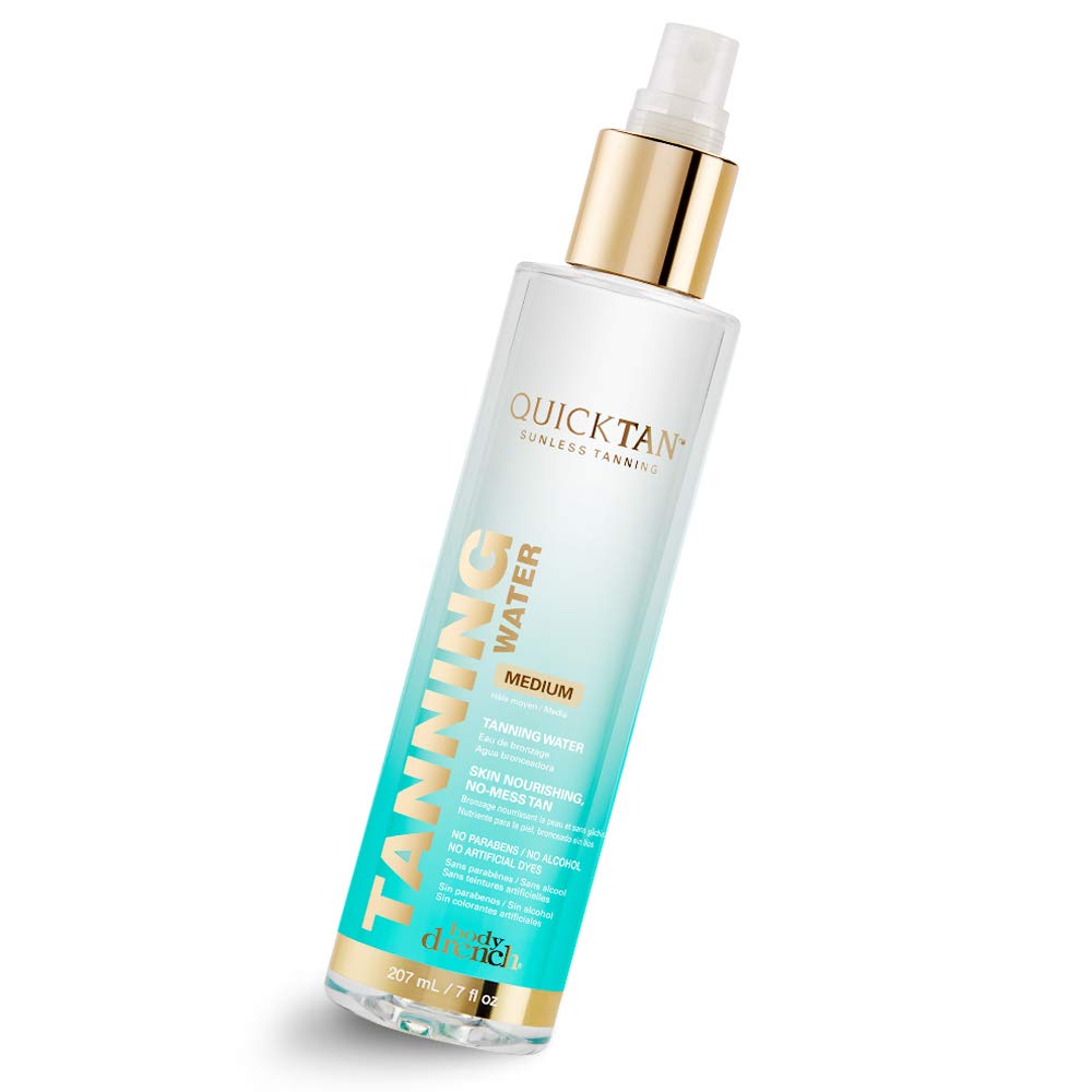 MADE IN USA, 100 % CRUELTY-FREE SUNLESS TANNER: Get only the top tier quality sunless tanner for you! Body Drench Tanning Water is free from any nasties you wouldn't want to find in your favorite tanner! It is paraben-free, alcohol-free, sulfate-free, phthalate-free, and has no artificial dyes. Proudly made in the USA, vegan-friendly, and 100% cruelty-free, too! It’s no surprise this is the favorite tanning brand among skincare experts, salon, and spa-enthusiasts!. CONVENIENT, EASY TO USE BRONZING SPRITZ: Achieve a gorgeous post-vacation glow without actually stepping on a plane or baking in the sun's harmful UV rays with Body Drench Tanning Water! Perfect if you want to feel like a bronzed goddess without needing to leave the house, this self-tanner helps you to develop that fresh-from-the-beach look gradually over 2-3 hours with minimum effort. Simply spray onto skin, and then be prepared to be asked where you’ve secretly jetted off to!. CLEAR WATER FORMULA, NO MESS TANNING WATER SPRAY: Want to take the mess out of self-tanning? Body Drench Tanning Water will make tanning more of a breeze and less of a chore! A must-have for tanning aficionados, this easy to use, streak-free, transfer-resistant self-tanning sprayer has a transparent water formula that goes on evenly and smoothly on your skin without staining your towels or transferring onto your pastel summer dresses. For a no-fuss golden glow, reach out for this!. ACHIEVE A NATURAL GOLDEN TAN GLOW: Tired of those self-tanning formulas that leave you with streaks, uneven blotches, and dark orangey patches that scream, "Hey! This tan is fake!"? Here’s Body Drench Tanning Water that’s designed to put an end to your fake tan faux pas, and grant you a more realistic, natural-looking faux glow! This sunless tanner can be used on the face and body for that all-over, fresh-from-the-beach color. Spritz for a sexy bronzed look and get ready for the envious glances!. SUNLESS TANNING, HYDRATE WHILE YOU ILLUMINATE: Give your skin ultra-hydration alongside a beautiful golden tan glow with Body Drench Tanning Water! Infused with a nourishing blend of botanical extracts such as Coconut Water, Aloe, Chamomile, and Calendula to moisturize and nourish the skin leaving behind a luminous, sun-kissed radiance without the sun! Its lightweight, clear water formula is perfect for all skin types. Get a gorgeous, healthy tan without a sign of dryness or damage!.