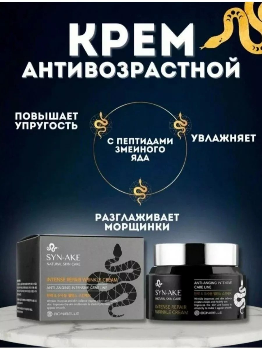 Интенсивный крем содержит пептид Syn-Ake и оказывает активное антивозрастное действие: разглаживает мимические морщины, устраняет тусклый цвет лица и возрастную пигментацию, увлажняет кожу и восстанавливает её эластичность и гладкость. Интенсивный крем против морщин с пептидом змеиного яда Syn-ake, действие которого подобно яду гадюки, снижает уровень работы мимической мускулатуры. Этот компонент безопасно воздействует на кожу лица, позволяет без применения уколов или хирургического вмешательства заметно омолодить кожу, разгладить морщины и предупредить появление новых. Антивозрастной крем разглаживает возрастные вертикальные и горизонтальные морщинки на лице лбу шее и зоны декольте. Повышает упругость и эластичность кожи, помогает справиться с мимическими морщинами, ключевой компонент пептид змеиного яда блокирует нервные импульсы благодаря чему мышцы лица не сокращаются происходит их расслабление. Уходовая косметика для лица с ретинолом и глицином помогает сохранять и гладкость кожи. Способ применения: Небольшое количество крема нанести на лицо похлопывающими движениями распределить крем по поверхности кожи.