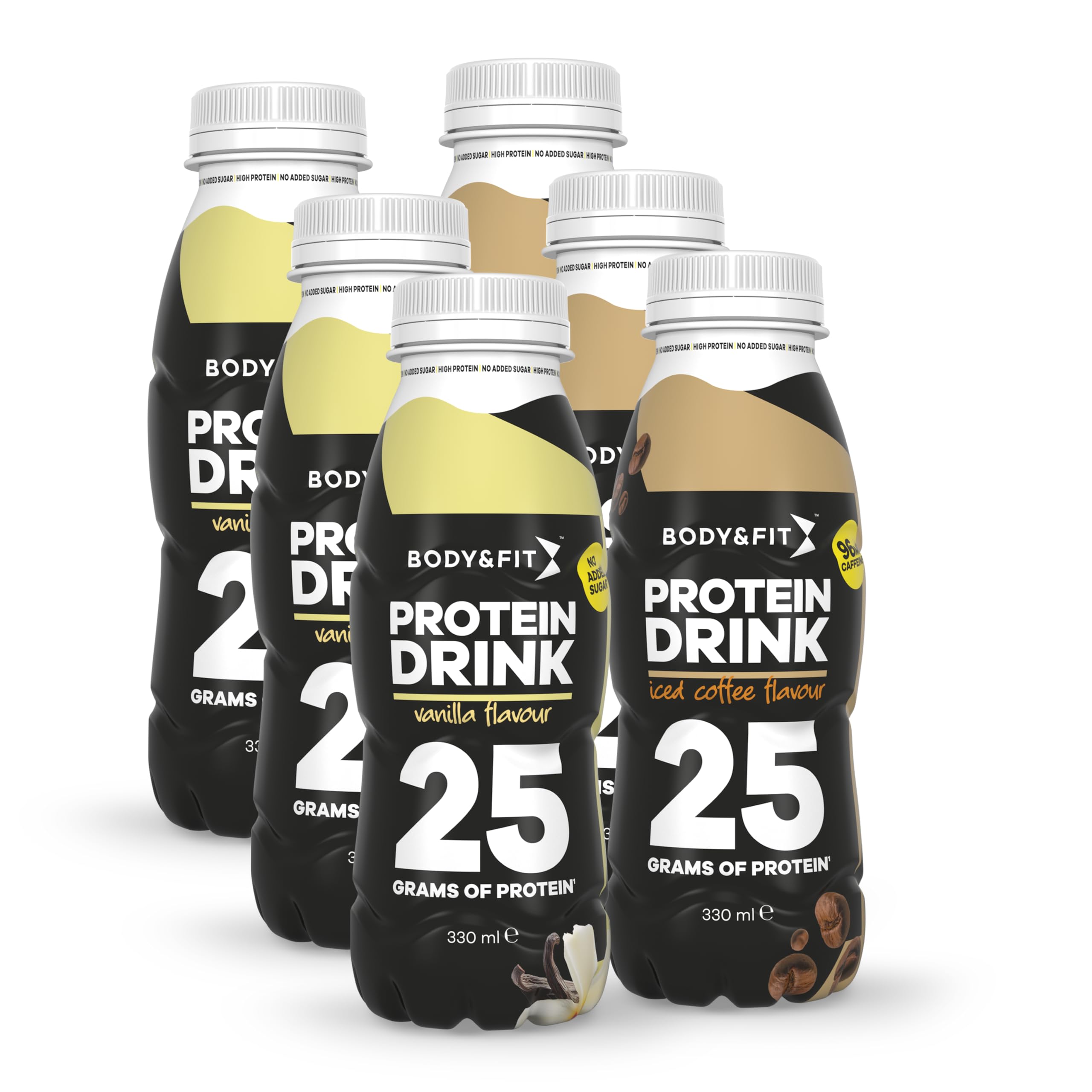 Body Fit Protein Drink – Your protein boost in a convenient bottle. Looking for an easy and tasty way to increase your protein intake? Body Fit's Protein Drink is a ready-to-drink protein shake with no less than 25 grams of high-quality protein per bottle. Perfect for athletes and anyone with an active lifestyle! Benefits of Body Fit Protein Drink: 25 grams of protein per bottle - supports muscle recovery and building. Fat-free - a responsible choice as part of a balanced diet. Ready to drink - no shaker cup or preparation required. Delicious flavors - enjoy a creamy and tasty protein boost. Great for on-the-go - perfect after your workout, work, or as a quick snack. Who is this Protein Drink for? This protein drink is ideal for: Athletes who want to optimally nourish their muscles after a workout anyone following a high-protein diet or needing a protein supplement and people with busy lifestyles who need a quick and nutritious snack. Enjoy the delicious Body Fit protein drink any time of day and give your body the protein it needs! INGREDIENTS Milk protein isolate, skimmed milk, water, flavoring, color (carotenes), acidity regulator (sodium citrates), stabilizers (carrageenan, gelling gum), sweetener (sucralose) INSTRUCTIONS FOR USE Close tightly after opening, keep refrigerated (4 C - 7 C), and consume within 3 days. For the batch code best before: see the packaging. SAFETY WARNING Use this product in conjunction with a varied and balanced diet and a healthy lifestyle. See moreBody Fit Protein Drink, Shake protéiné prêt à l'emploi, complément protéiné, vanille et café glacé, 6 x 330 ml Boîte de mélange 6x330 mlDESCRIPTION DU PRODUIT DESCRIPTION DU PRODUIT Body Fit Protein Drink – Votre boost de protéines dans une bouteille pratique Vous cherchez un moyen facile et savoureux d'augmenter votre apport en protéines ? La Protein Drink de Body Fit est un shake protéiné prêt à l'emploi avec pas moins de 25 grammes de protéines de haute qualité par bouteille. Parfait pour les athlètes et toute personne ayant un style de vie actif! Avantages de la Boisson protéinée Body Fit : 25 grammes de protéines par bouteille - soutient la récupération musculaire et le renforcement musculaire Sans graisse - Un choix responsable au sein d'une alimentation équilibrée Prêt à l'emploi - Pas besoin de tasse à shake ou de préparation Saveurs délicieuses - Profitez d'un boost de protéines crémeux et savoureux Idéal pour les déplacements - Parfait pour après votre entraînement, votre travail ou comme collation rapide Pour qui est ce Protein Protein Boire ? La boisson protéinée est idéale pour : Les athlètes qui veulent nourrir leurs muscles de manière optimale après un entraînement Toute personne qui suit un régime riche en protéines ou qui a besoin d'un supplément de protéines Personnes ayant un mode de vie occupé qui ont besoin d'une collation rapide et nutritive Profitez de la délicieuse boisson protéinée Body Fit à tout moment de la journée et donnez à votre corps les protéines dont il a besoin! INGRÉDIENTS isolat de protéines de lait, lait écrémé, eau, arôme, colorant (carotènes), régulateur d'acidité (citrates de sodium), stabilisants (carraghénane, gomme de gel), édulcorant (sucralose) MODE D'EMPLOI Bien fermer après ouverture, conserver au réfrigérateur (4 C - 7 C) et consommer dans les 3 jours. Pour le code par lot au moins jusqu'à : voir l'emballage. AVERTISSEMENT DE SÉCURITÉ Utilisez ce produit en combinaison avec une alimentation variée et équilibrée et un mode de vie sain. Voir plus