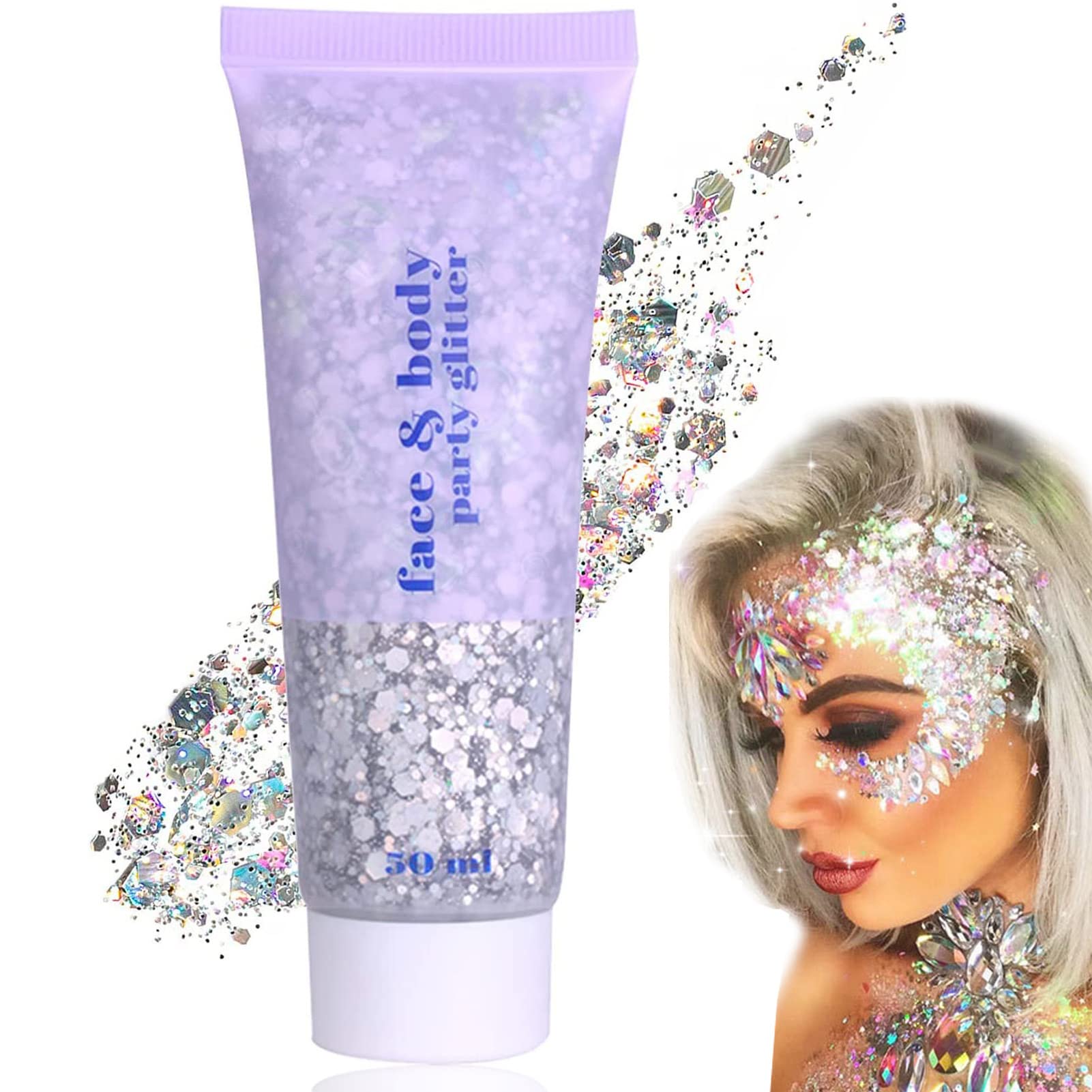 Face Glitters Body Gel Sequins Shimmer Liquid Eyeshadow, ensure you shimmer all day and all night-Make you a shining goddess. Specifications Capacity:50ml Color: Colorful, Blue, Gold, Pink, Silver, White(You can choose the color you want) Shelf time: 3 years Role:Beauty makeup manicure DIY Arts and crafts Facial glitter gel Perfect for everyday life, weddings, shows, stages and parties, it is the best gift for your female friends and wife around you for birthdays, festivals or parties. How to use and remove How to Use: Squeeze product onto your finger or brush. Apply to required area and allow to dry. How to Remove: Gently remove it with make-up remover and soap. Package includes: 1 X 50ml Body Glitter Gel Note: 1.The colors may have different as the difference display, please understand. 2.If you are allergic to adhesive, please do not apply on sensitive skin near eyes. 3.If irritation occurs, discontinue use.WIDE APPLICATION: The mermaid chunky glitter body gel can be used on the eyes, eyebrows, lips, cheeks, face, nails,hair and more. Suitable for parties, performances, stages, bars, etc. Also can be used for DIY some projects, such as phone cases and more. LONG LASTING WATERPROOF: Our sequin gel chunky glitter do not fade, Long-lasting, Brighten, waterproof , Easy to Wear, Quickly dry and easy daub dizzy catch, uniform color. MULTIPLE COLORS AVAILABLE: We offer this body glitter gel in five colors: Colorful, Blue, Gold, Pink, Silver, White. Each set of contains one 50ml bottles of face shimmering gels, you can choose the color you like, which can completely create the perfect look and make you the center of attention. PREMIUM MATERIAL: Body glitter gel is made of safe non-toxic materials and holographic gloss, which has strong adhesion, long-lasting and not easy to fall off. Perfect for all skin types. SHINY GORGEOUS: Little stars, little moons and hexagons are included in the glitter gel. The sheen and color of the laser sequins change with the angle for an irresistible glow that can make you look more glamorous and stylish.