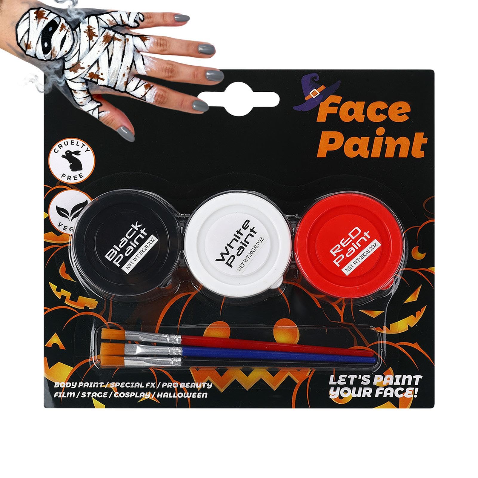 This body and face makeup kit offers a versatile solution for face and body painting. Its water-soluble and washable formula makes cleanup easy. The included cream and tools ensure smooth application, suitable for both children and adults. Perfect for Halloween makeup kits, costumes, or events such as gothic parties, sporting events, and themed gatherings. Create creative designs like clown, vampire, witch, or skeleton looks with comfort and ease of use. This body and face makeup is an ideal choice for women and men seeking vibrant, hassle-free results. Unleash your creativity and stand out at any occasion with this reliable and adaptable makeup kit. Product Attributes: Material: Water-soluble paint Size: 19.5 x 17.3 x 3.2 cm 7.68 x 6.81 x 1.26 inches Weight: 119 g Features: Water-soluble formula for easy cleanup, vibrant colors, and easy application Note: Due to different lighting and screen settings, the item's color may be slightly different from the picture. Due to different manual measurements, please allow a 1-2 cm size difference. Product List: Halloween Face Paints 3 pieces Brushes 3 pieces SAFETY WARNING Not applicableNon-Irritating Artistic Choice: Formulated with a soft feel, this adult body paint minimizes discomfort on sensitive skin and promotes worry-free creativity during Halloween makeup workshops, photoshoots, or art projects. Perfectly safe for all ages, it's suitable for various occasions such as parties or family activities, offering a soft, irritation-resistant finish. Water-Soluble Formula: This Halloween face paint features a fully water-soluble formula that simplifies cleanup after the party by removing all impurities from skin or clothing without leaving any residue. This convenient feature enhances convenience and allows for more time to enjoy the fun at themed celebrations or costume contests, reducing cleanup hassles and promoting a pleasant experience. Creative Festive Makeup: The Halloween face paint includes a palette of three blendable colors that opens up continuous and unlimited design possibilities, allowing users to achieve polished and impactful effects suitable for Halloween nights, parties, and other celebratory occasions. Each application delivers festive and successful results, with ease of use that encourages innovation and personal expression. The vibrant colors and buildable texture make this makeup incredibly versatile. Compact and Lightweight: Thanks to its compact and portable design, this Halloween makeup takes up minimal space in bags, making it easy to carry everywhere. This makes it an excellent choice for quick applications during spooky events or creative gatherings, without taking up too much room. Lightweight and discreet, it offers exceptional convenience for Halloween makeup on the go. Long-Lasting: The makeup adheres to the skin, providing a streak-free application with rich, saturated pigments for vibrant and even color, enhancing visual appeal during celebrations, performances, or creative projects without worrying about smudging or fading. Its long-lasting formula ensures extended wear, ideal for parties, cosplay, or artistic activities, maintaining a brilliant look for hours without fading.Peinture Corporelle Pour La Peau Crème De Maquillage Lavable Peinture Visage Cosplay 3 Couleurs,Pour Déguisement Cosplay Événements Sportifs Adultes Clown Squelette Noir et blancDESCRIPTION DU PRODUIT DESCRIPTION DU PRODUIT Le maquillage corps et visage offre une solution polyvalente pour la peinture faciale et corporelle, avec sa formule soluble dans l'eau et lavable rendant le nettoyage facile. La crème et les outils inclus assurent une application fluide, adaptée aux comme aux adultes. Parfait pour les kits de maquillage d'Halloween, les costumes ou les événements tels que les soirées gothiques, les événements sportifs et les rassemblements à thème. Réalisez des designs créatifs tels que des looks de clown, vampire, sorcière ou squelette tout en confort et facilité d'utilisation. Ce maquillage corps et visage est un choix idéal pour les femmes et les hommes recherchant des résultats vibrants et sans tracas. Renforcez votre créativité et démarquez-vous lors de toute occasion avec ce kit de maquillage fiable et adaptable. Attributs du produit : Matériau : Peinture soluble dans l'eau Taille: 19,5 x 17,3 x 3,2 cm 7,68 x 6,81 x 1,26 pouces Poids : 119 g Caractéristiques : Formule soluble dans l'eau pour un nettoyage facile, des couleurs vives et une application facile Remarque : en raison des différents paramètres d'éclairage et d'écran, la couleur de l'article peut être légèrement différente de celle de l'image. En raison des différentes mesures manuelles, veuillez prévoir une différence de taille de 1 à 2 cm. Liste de produits : Peintures pour le visage d'Halloween 3 pièces Brosse 3 pièces AVERTISSEMENT DE SÉCURITÉ N'est pas applicableChoix Artistique Non Irritant: Élaborée r une sensation douce, cette peinture corporelle r adultes minimise l'inconfort sur les peaux sensibles et favorise la créativité sans souci lors des formations maquillage Halloween, des séances photo ou des projets artistiques. Parfaitement sûre r les âges, elle convient à diverses occasions comme les fêtes ou les activités familiales, en offrant une finition douce et résistante aux irritations. Formule Soluble à l'Eau: Ce maquillage r le visage Halloween offre une formule entièrement soluble dans l'eau qui simplifie le nettoyage après les fêtes en éliminant toutes les impuretés sur la peau ou les vêtements sans laisser de résidus. Cette caractéristique pratique améliore la commodité et permet de consacrer plus de temps aux divertissements lors de célébrations thématiques ou de concours de déguisements, en réduisant les tracas de nettoyage et en favorisant une expérience agréable. Maquillage Festif Créatif: Le maquillage visage Halloween inclut une palette de trois couleurs mélangeables qui ouvre des