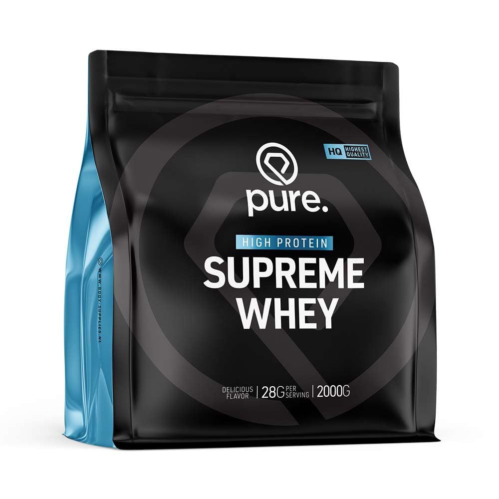 SUPREME WHEY from PURE has the best price quality ratio in Europe! PURE Supreme Whey contains no less than 22.3g proteins per protein shake. PURE SUPREME WHEY PROPERTIES: Delicious milkshake flavors and perfect solubility make PURE Supreme Whey your protein shake! Do you want to achieve maximum performance and growth? . Then you will also have to recover as much as possible! Proteins are essential. Proteins support rapid recovery of your muscles after your training [ training ]. There are many types of proteins for sale, but what you need is a protein product that provides your muscles with 100 undamaged, and therefore fully effective, proteins. Most protein products contain proteins that have been damaged by a cheap production process. The bioavailability (absorption rate) of the proteins is therefore lower and the proteins have largely lost their positive properties. PURE Supreme Whey does offer you the best proteins, completely sourced from the very best whey protein [ proteins protein shakes whey-protein ]! Manufactured in a unique and patented production process and therefore not damaged. PURE Supreme Whey therefore supplies your muscles with the right amount of protein for quick recovery of your muscles after your training. But that's not all. PURE Supreme Whey is made instant using this latest production technique, creating a very fine powder with truly unique dissolving properties. Finally a protein shake [ proteins protein shakes ] that does not clump or leave residues and dissolves completely! PURE Supreme Whey is of a rare high quality class and can no longer be compared with standard whey protein products. Do you choose the best for your muscles? Then choose PURE Supreme Whey! Superior quality proteins with delicious flavors at the lowest price in Europe! PURE SUPREME WHEY FEATURES: Delicious, creamy milkshake flavors 79.8 protein per serving Superior quality Whey Concentrate INGREDIENTS Per serving: 28 g Energy 451.6 kJ 107.7 kcal, Proteins 21.4 g, Carbohydrates 2.5 g 2.0 g (Of which sugars, Fats 1.7 g 1.1 g, Of which saturated, Fiber 0.42 g, Salt 0.49 g, Sodium 0.20 g, Potassium 235.1 mg, Calcium 65.3 mg) Whey protein concentrate (milk, soy lecithin), lean cocoa powder, flavoring (caramel) and sweetener (sucralose). Energy 451.6 kJ 107.7 kcal, Protein 21.4 g, Carbohydrates 2.5 g 2.0 g (Of which sugars, Fats 1.7 g 1.1 g, Of which saturated, Fiber 0.42 g, Salt 0.49 g, Sodium 0.20 g, Potassium 235.1 mg, Calcium 65.3 mg) INSTRUCTIONS FOR USE Mix 1 scoop (28 g) with 200 ml of milk. Take a Supreme Whey shake immediately after every (heavy) effort. A second shake can be taken, for example, in the morning, after breakfast. The recommended daily amount is 1-2 shakes. See moreSUPREME WHEY from PURE has the best price quality ratio in Europe! Supreme Whey contains no less than 22.3g of protein per protein shake.-Supreme Whey 2000gr Chocolade Caramel SUPREME WHEY van PURE bevat de beste prijs kwaliteit verhouding van Europa! PURE Supreme Whey bevat maar liefst 22,3g eiwitten per eiwitshake. PURE SUPREME WHEY EIGENSCHAPPEN: Heerlijke milkshake smaken en een perfecte oplosbaarheid maken PURE Supreme Whey jouw eiwit shake! Wil je maximaal presteren en groeien? … Dan zul je ook maximaal moeten herstellen! Eiwitten zijn daarbij essentieel… Eiwitten ondersteunen namelijk snel herstel van je spieren na je training [ training ]. Er zijn veel soorten eiwitten te koop, maar wat jij nodig hebt is een eiwit product dat jouw spieren voorziet van 100 onbeschadigde, en dus volledig werkzame, eiwitten. De meeste eiwitproducten bevatten eiwitten die door een goedkoop productieproces beschadigd zijn geraakt. De biologische beschikbaarheid (opnamesnelheid) van de eiwitten is daardoor lager en de eiwitten hebben grotendeels hun positieve eigenschappen verloren. PURE Supreme Whey biedt jou wél de beste eiwitten, volledig afkomstig uit de allerbeste wei proteïne [ eiwitten eiwitshakes whey-proteine ]! Vervaardigd in een uniek en gepatenteerd productieproces en daardoor niet beschadigd geraakt. PURE Supreme Whey levert jouw spieren daardoor de juiste hoeveelheid eiwitten voor snel herstel van je spieren na je training. Maar dat is nog niet alles. PURE Supreme Whey is met deze nieuwste productietechniek instant gemaakt, waardoor een zeer fijn poeder is ontstaan met werkelijk unieke oploseigenschappen. Eíndelijk een eiwit shake [ eiwitten eiwitshakes ] die niet klontert of resten achterlaat en volledig oplost! PURE Supreme Whey is van een zeldzaam hoge kwaliteitsklasse en eigenlijk niet meer te vergelijken met standaard wei eiwitproducten. Kies je voor het beste voor jouw spieren? Kies dan voor PURE Supreme Whey! Superieure kwaliteit eiwitten met heerlijke smaken tegen de laagste prijs van Europa! PURE SUPREME WHEY KENMERKEN: Heerlijke, romige milkshake smaken 79,8 eiwit per dosering Superieure kwaliteit Whey Concentraat INGREDIËNTEN Per serving: 28 g Energie 451,6 kJ 107,7 kcal, Eiwitten 21,4 g, Koolhydraten 2,5 g 2,0 g (Waarvan suikers, Vetten 1,7 g 1,1 g, Waarvan verzadigd, Vezels 0,42 g, Zout 0,49 g, Natrium 0,20 g, Kalium 235,1 mg, Calcium 65,3 mg) Wei eiwit concentraat (melk, soja lecithine), magere cacaopoeder, smaakaroma (caramel) en zoetstof (sucralose). Energie 451,6 kJ 107,7 kcal, Eiwitten 21,4 g, Koolhydraten 2,5 g 2,0 g (Waarvan suikers, Vetten 1,7 g 1,1 g, Waarvan verzadigd, Vezels 0,42 g, Zout 0,49 g, Natrium 0,20 g, Kalium 235,1 mg, Calcium 65,3 mg) GEBRUIKSAANWIJZING Meng 1 maatschep (28 g) met 200 ml melk. Neem direct na elke (zware) inspanning een Supreme Whey shake. Een tweede shake kan bijvoorbeeld in de ochtend, na het ontbijt genomen worden. De dagelijks aanbevolen hoeveelheid bedraagt 1-2 shakes. Meer bekijkenSUPREME WHEY van PURE bevat de beste prijs kwaliteit verhouding van Europa! Supreme Whey bevat maar liefst 22,3g eiwitten per eiwitshake.