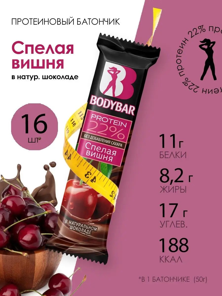 Батончик протеиновый BODYBAR 22% "Спелая Вишня в горьком шоколаде", 16 штук в коробке, 1 шт 50 г. – это пищевой продукт с высоким содержанием белка, он является важной составляющей сбалансированного питания. Протеиновый снек станет незаменимой частью рациона или же заменит полноценный прием пищи, подойдет ДЛЯ ТЕХ, КТО ВЕДЕТ ЗДОРОВЫЙ ОБРАЗ ЖИЗНИ, ПРИДЕРЖИВАЕТСЯ ПРАВИЛЬНОГО ПИТАНИЯ И СПОРТИВНОГО ПИТАНИЯ, ЗАНИМАЕТСЯ СПОРТОМ. Питательный диетический батончик в горьком шоколаде с нежнейшей начинкой крем-брюле - полезная сладость и идеальный перекус на каждый день или по выходным, отличная альтернатива высокоуглеводным десертам к чаю или кофе, подходит для кето-диеты. Батончик с высоким содержанием белка БЕЗ ГЛЮТЕНА подойдет ДЛЯ БЫСТРОГО НАБОРА МЫШЕЧНОЙ МАССЫ, ПРЕДТРЕНИРОВОЧНОЙ ЗАГРУЗКИ, ВОССТАНОВЛЕНИЯ СИЛ ПОСЛЕ ТРЕНИРОВКИ, а также В КАЧЕСТВЕ СПОРТИВНОГО И ПРАВИЛЬНОГО ПЕРЕКУСА, отличный ИСТОЧНИК ВИТАМИНОВ И МИНЕРАЛОВ. В протеиновых батончиках BODYBAR содержится сывороточный (whey protein) и молочный протеины высокой очистки в высокой концентрации - 22%. Фитнес батончики BODYBAR – вкусно и полезно, также подходит для набора массы и создания идеальной фигуры и даже как перекус в школу для детей. Батончик Спелая Вишня в горьком шоколаде С ВИТАМИННО-МИНЕРАЛЬНЫМ КОМПЛЕКСОМ состоит из изолята сывороточного белка — это высококачественный белок с наивысшей биологической ценностью; и концентрата молочного белка – быстроусвояемый протеин. Снеки от BODYBAR – это полезный перекус, ЯВЛЯЮТСЯ ИСТОЧНИКОМ КЛЕТЧАТКИ, КОТОРАЯ НОРМАЛИЗУЕТ МЕТАБОЛИЧЕСКИЕ ПРОЦЕССЫ, УЛУЧШАЕТ ПИЩЕВАРЕНИЕ И СНИЖАЕТ УРОВЕНЬ ХОЛЕСТЕРИНА В КРОВИ. Инулин в составе – это природный пребиотик и сахарозаменитель, который становится питательной средой для размножения и роста полезных бифидобактерий в желудочно-кишечном тракте. В коробке находится 16 штук протеиновых батончиков – это очень удобно, ведь Вы не останетесь голодными, можно брать правильный перекус с собой на учебу, тренировку прогулку, работу, также удобно брать в поход или поездку. BODYBAR с заботой о вашем организме!