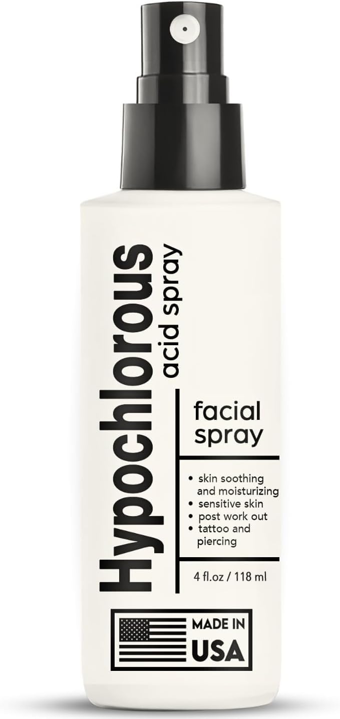 FINE MIST SPRAY BOTTLE: Delivers Gentle, Even Mist for Precise Application Without Waste. Leak-proof 4 Fl Oz (118 Ml) Design Ensures No Spills, Making It Perfect for Travel, Gym, or Daily Use. Compact and Lightweight for Easy Storage in Bags or Kits. MADE IN USA: Produced in Certified Facility and Lab Tested for Quality and Safety. Manufactured Using Sustainable Methods, Offering High-Quality, Eco-Friendly Solution. FINE MIST APPLICATION: Ultra-fine Spray Ensures Even Coverage and Quick Absorption without Sticky Residue. VERSATILE FACIAL SPRAY: Helps Maintain Clean Skin, Reduces Visible Redness, Helps Reduce Recovery for New Piercing, Natural Tattoo Aftercare. Ideal for Face Toner Personal Hygiene, Facial Cleanser After Workout, Post-Cosmetic Treatments, Travel Skincare Essentials. PURE GENTLE FORMULA: Advanced HOCL Formula Is Non-irritating and Safe for All Skin Types. Ph-balanced, Alcohol-Free, Fragrance-free. Hypoallergenic and Non-Comedogenic. Gentle Natural Formula for Sensitive Skin, Acne Prone Areas, Rosacea, Dry Scalp and Everyday Skin Care. SAFE FOR EYES SKIN: Gentle Hypochlorous Acid Spray for Eyes, Face, and Body. Helps Maintain Natural Balance without Stinging. Ideal for Sensitive Areas, Supports Daily Cleansing and Freshness With Soothing Mist That Absorbs Quickly. Perfect Skin Spray for Active Skin Repair. EFFECTIVE RECOVERY FACE SPRAY: Face Spray Hypochlorous Acid Refreshes and Hydrates Skin. Designed For Daily Use, It Supports Clean, Balanced Skin Without Irritation. Perfect for After Gym Face Spray, Tattoo and Piercing Aftercare, Daily Active Skin Repair. Powered by 0.02 Hypochlorous Acid.