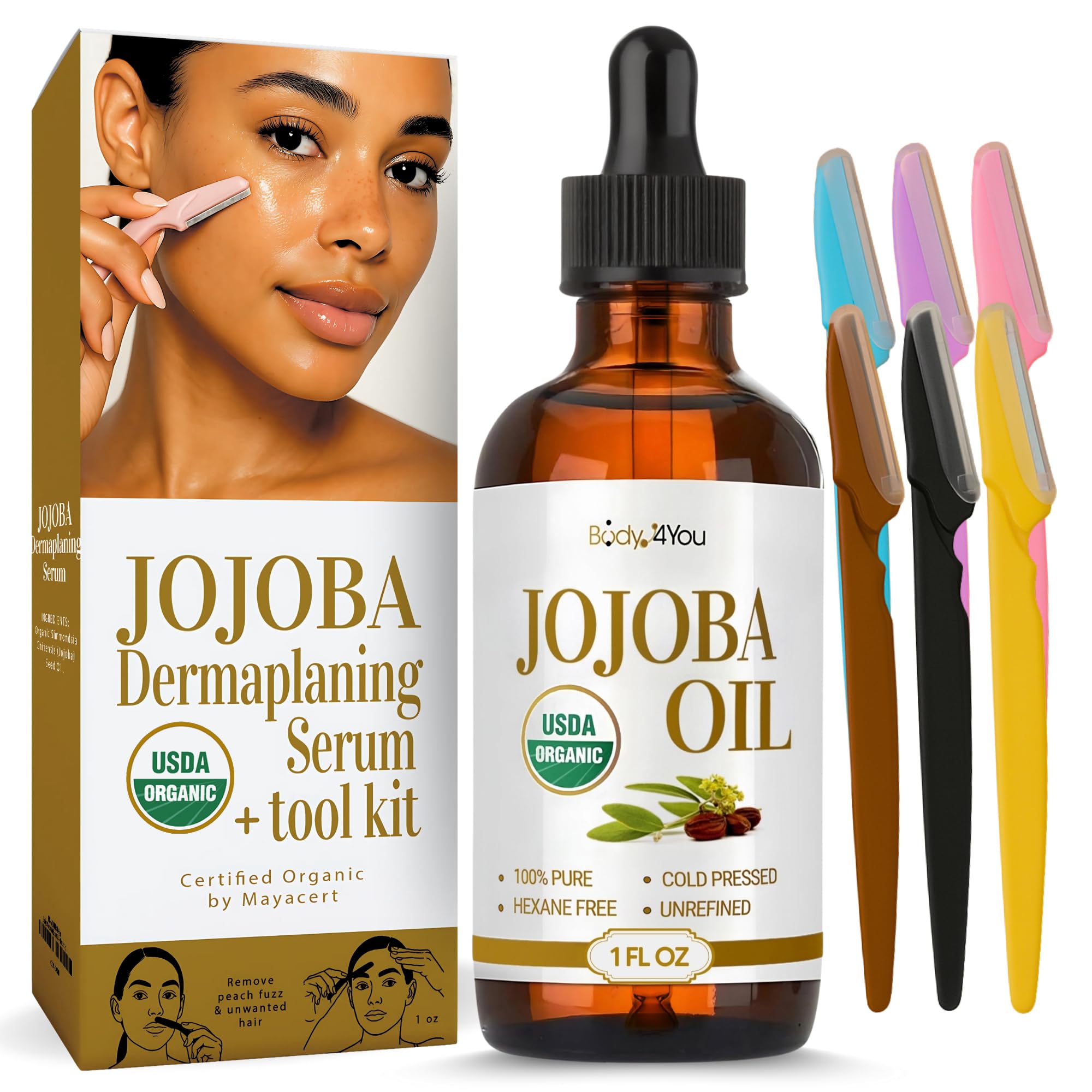 FACIAL HAIR REMOVAL KIT: Includes 6 Precision Razors for Safe and Controlled Dermaplaning Eyebrow Trimming and Peach Fuzz Removal. 1 Fl Oz Dropper Bottle for Accurate Oil Application. Amber Glass Protects Oil from Light. MADE IN USA: Sustainably Harvested Gently Processed Kosher Certified Vegan and Cruelty-Free. ESSENTIAL FOR COLLAGEN PRODUCTION: Supports Creation of Collagen Improving Skin Condition Texture Reducing Appearance of Fine Lines and Wrinkles. Deeply Nourishing for Nails Helping to Repair and Strengthen Them for Normal Growth. Enhances Skin Comfort After Razor Use and Hair Removal. PACKED WITH VITAMINS ANTIOXIDANTS MINERALS: Vitamins A, B and E, Omega-3, Fatty Acids, Antioxidants and Crucial Minerals - Zink Copper Chromium. Our Jojoba Oil Battles Aging Indicators Amplifies Skin Elasticity and Supports Smoother Complexion if Applied Daily and Regularly. ALL-IN-ONE NATURAL CARE: Skin Hair Body Nourishment - Suitable for All Skin Types Our Lightweight and Rapidly Absorbing Jojoba Oil Hydrates Face Hair and Body Enhancing Skin Scalp and Beard Health While Supporting Facial Grooming Dermaplaning and Eyebrow Shaping with Included Razors. PREMIUM ORGANIC: Cold Pressed USDA Certified Golden Jojoba Oil is 100 Pure Not Diluted High-Quality Non-GMO No Additives Alcohol Free Chemical Free Hexane Free Unscented Vegan Product. Perfect for Daily Routine Care - One Solution for Glowing Skin, Hair Growth and Healthy Nails.