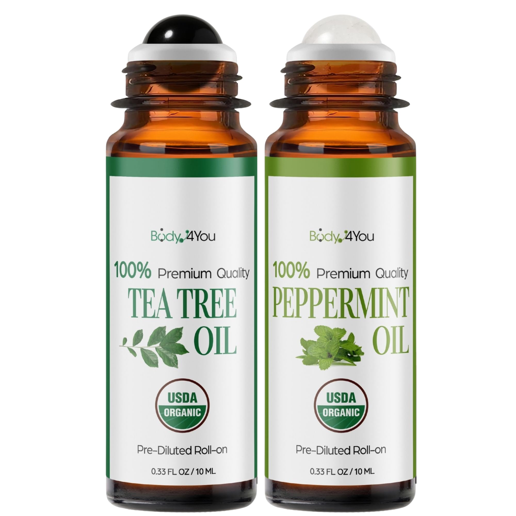 Meet the simplest way to wear essential oils every day: a pocket roll on filled with aromatic botanicals, comfortably diluted in lightweight MCT coconut oil. The clear, fast absorbing base cushions skin and lets scent sit close, never heavy. Glide the roller across wrists, temples, neck, or behind ears for a quiet, personal aura that supports the moment, whether you want to settle before bed, reset between meetings, or add a gentle finish after skincare. Each blend begins with the same dependable foundation. MCT oil is neutral in scent, spreads evenly, and sinks in quickly, so the focus stays on the botanicals. Citrus feels bright on busy mornings. Florals read soft and serene for winding down. Woods and resins bring a grounded, cozy mood. Mints and herbs feel crisp after a workout or a long day of travel. Wear a single note for clarity, pair two for depth, or rotate through the week to match your routine. Application stays simple. Roll a small amount onto clean skin and breathe normally, then reapply as needed without a greasy afterfeel. Use during meditation, breathwork, yoga, or journaling to mark the start of a practice. Keep one on your desk for a midafternoon refresh. Tuck one in your gym bag for a post shower finish. Slip one into a carry on to help create a familiar sense of home wherever you land. Care is straightforward. Patch test before first use. For external use only. Avoid the eye area. Stop use if irritation occurs. Keep closed, upright, and away from heat or direct sun. Because all blends share the same MCT base, they layer well with fragrance free skincare and will not compete with your favorite body lotion or hand cream, leaving a clean, soft veil of botanicals that fits easily into daily life.QUALITY AND STANDARDS: USDA Organic ingredients, vegan and cruelty free, USA bottled in a certified facility, small batch filled and safety sealed with traceable sourcing, no parabens or mineral oil, no dyes or fragrance enhancers, contains coconut derivative as the carrier base. SIMPLE APPLICATION ROUTINE: Roll a thin line on clean skin across wrists, temples, neck, pulse points, or targeted areas, let absorb before layering other products, reapply as needed through the day, keep bottles at desk, bedside, or in bag for quick resets at work, gym, or travel. PEPPERMINT COOLING FOCUS: Crisp mint aroma provides a cooling feel on temples, neck, and tension areas while supporting a clear focused mindset during study, work, or commute, fast absorbing MCT base enables thin layers and quick reapplication without buildup for a fresh comfortable finish. TEA TREE TARGETED CARE: Fresh herbal tea tree helps maintain clean looking skin on targeted spots, cuticles, feet, and along the scalp line, delivers a focused glide that absorbs quickly with no greasy residue, ideal for on the go touch ups and daily maintenance during travel or gym routines. PREMIUM OIL DUO WITH STONE ROLLERS: Two roll ons featuring USDA Organic 100 pure tea tree and peppermint pre diluted in organic MCT coconut oil, paired with black obsidian and clear quartz stone rollers for controlled glide in durable amber glass bottles, travel size 10 ml each.