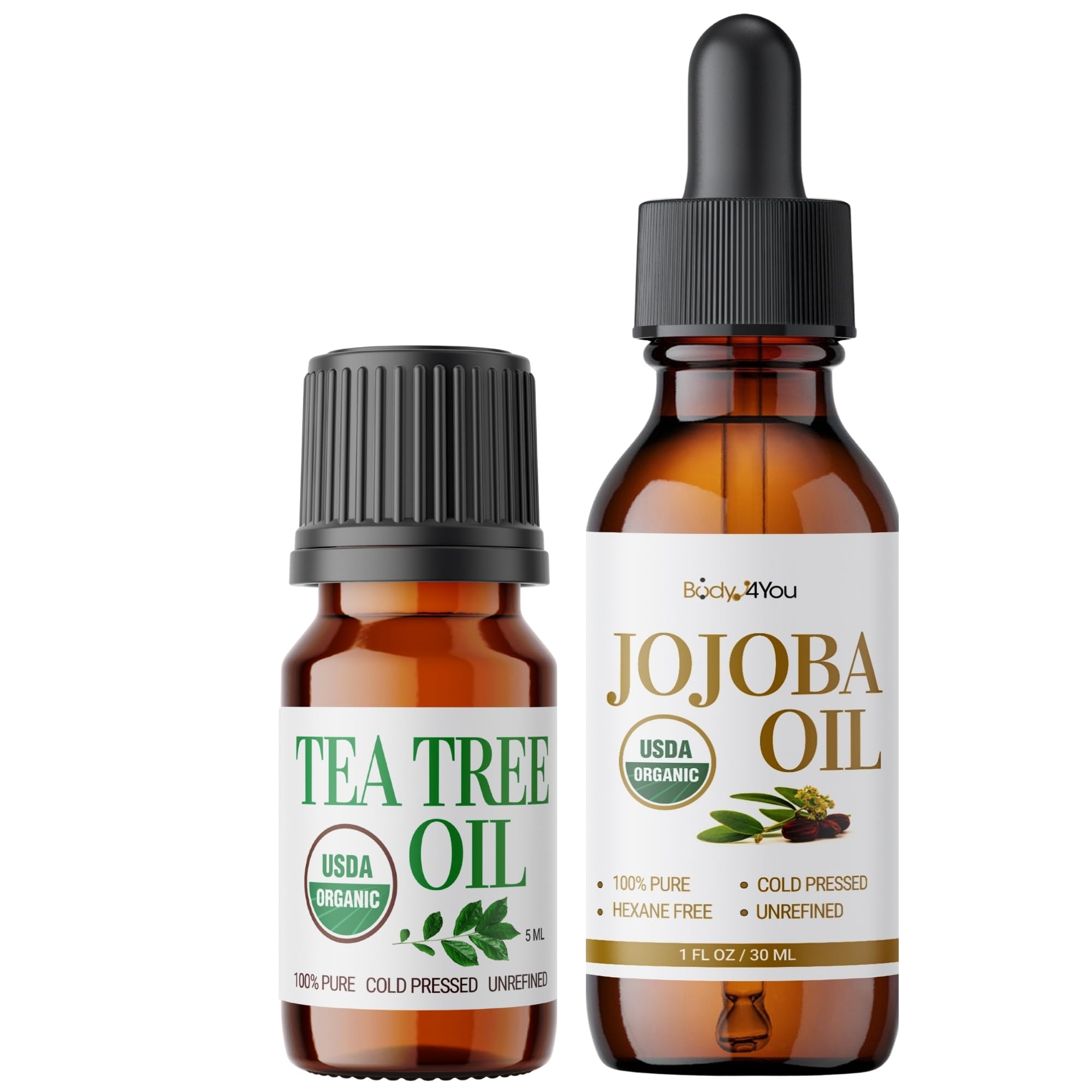 This bundle includes USDA certified organic jojoba oil and USDA certified organic tea tree oil, offered together for multipurpose skincare, scalp and hair care, nail conditioning, massage, and aromatherapy. The jojoba oil is cold pressed, unrefined, and golden in appearance. It is 100 percent pure, undiluted, non GMO, vegan, hexane free, alcohol free, and unscented. The oil is bottled in a dark amber glass bottle with a dropper for accurate application and protection from light exposure. Jojoba oil serves as a carrier base for essential oils and is applied for face hydration, scalp balance, beard conditioning, and body care. It is suitable for use with massage blends, gua sha preparation, dermaplaning, or makeup removal. A few drops provide daily nourishment for multiple applications. The tea tree oil is steam distilled from South African leaves for purity and potency. It is undiluted, non GMO, vegan, cruelty free, and bottled in UV protected amber glass to maintain freshness. Tea tree oil is used for scalp care, nail and cuticle conditioning, and supporting comfort of dry or rough feet when blended with carrier oil. It is also applied in DIY skincare such as toners, masks, or serums. For aromatherapy, a few drops in a diffuser create blends that refresh indoor spaces. Packaged together, these two oils provide a complete set. Jojoba oil functions as a neutral base carrier, while tea tree oil offers a concentrated essential oil. This pairing supports versatile use across skincare, scalp, hair, nails, and aromatherapy. Both oils are USDA certified organic, vegan, cruelty free, and bottled in USA facilities. Amber glass packaging protects quality and extends shelf life. This bundle delivers sustainable, certified, and multipurpose oils in compact bottles for consistent use in personal care and home aromatherapy.QUALITY ASSURANCE: Both Oils USDA Certified Organic Bottled In Usa Packaged In Protective Amber Glass For Freshness Sustainable Cruelty Free Non Gmo Vegan Suitable For Multipurpose Daily Use Across Personal Skincare Haircare And Aromatherapy Routines. USDA ORGANIC TEA TREE OIL: Steam Distilled Pure Tea Tree Essential Oil From South Africa Undiluted Non Gmo Vegan Cruelty Free Bottled In Uv Protected Amber Glass For Potency Suitable For Scalp Nail Cuticle And Foot Care Diy Skincare And Aromatherapy. USDA ORGANIC JOJOBA OIL: Cold Pressed Unrefined Golden Jojoba Oil 100 Percent Pure Undiluted Non Gmo Vegan Hexane Free Alcohol Free Unscented In Amber Glass Dropper Bottle Supports Face Hair Beard Scalp And Body Hydration Massage Carrier Blends. BUNDLE VERSATILE USE: Jojoba Oil Functions As Base Carrier Oil While Tea Tree Oil Provides Concentrated Essential Oil Both Complement Each Other For Mixing Diy Skincare Toners Serums Body Oils Massage Blends And Diffuser Applications At Home Or Travel. BUNDLE DAILY CARE: Includes USDA Organic Jojoba Oil 1 Fl Oz And USDA Organic Tea Tree Oil 5 Ml Packaged Together For Multipurpose Use Across Skincare Hair Beard Nails Scalp Massage And Aromatherapy Providing A Complete Set For Routine Personal Care.