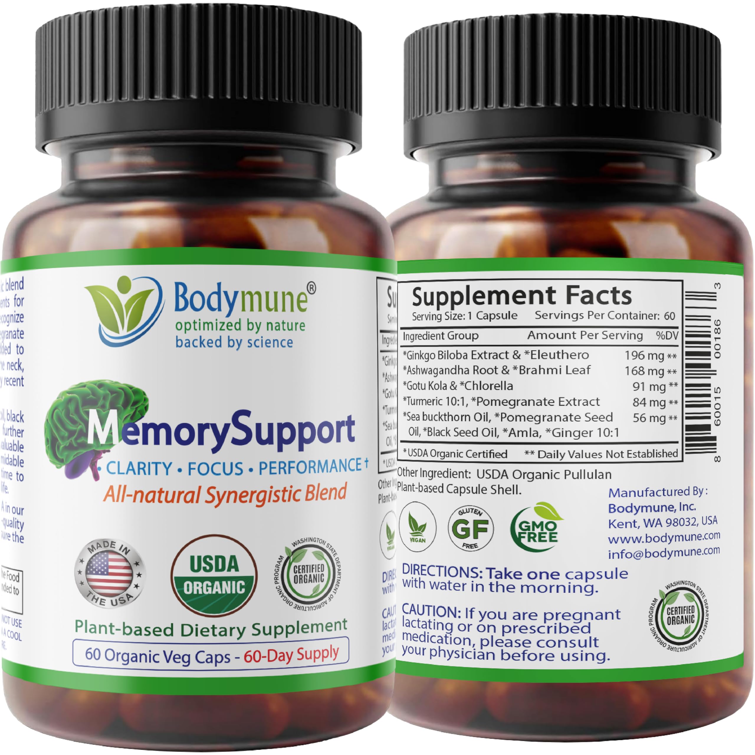 OUR TEAM'S COMMITMENT TO YOURS: As a dedicated small business, our mission is to create the wellness products we need and use ourselves. We are our own first customers. That's the Bodymune difference—a deep, personal belief by our founding partners in the power of organic, science-based solutions. OUR TEAM'S COMMITMENT TO YOURS: As a dedicated small business, our mission is to create the wellness products we need and use ourselves. We are our own first customers. That's the Bodymune difference—a deep, personal belief by our founding partners in the power of organic, science-based solutions. SEATTLE-MADE EXPERT FORMULATED: Developed by doctors and scientists and proudly made in our own Seattle-based, cGMP and USDA Organic Certified facility. Our commitment to third-party Certificates of Analysis (COA) for every ingredient ensures the highest levels of safety, purity, and consistency. 100 VEGAN CERTIFIED ORGANIC: Our vegan brain supplement is crafted entirely from USDA Organic, non-GMO ingredients. We believe in providing pure cognitive support without artificial additives, aligning with your ethical choices and wellness goals. It's a clean formula, free of gluten and dairy. ADAPTOGEN NOOTROPIC BLEND: Features a synergistic blend of revered nootropics and adaptogens, including Ginkgo Biloba, Ashwagandha, Brahmi, and Gotu Kola. These powerful herbs are combined with antioxidant-rich Turmeric and Pomegranate to provide comprehensive support for brain health. SUPPORTS COGNITIVE FUNCTION MENTAL CLARITY : Stay sharp and focused at any age. Our organic brain health supplement is designed for adults seeking to support cognitive function, recall, and mental clarity. It's a natural boost for your daily focus and a smart choice for your long-term brain wellness.