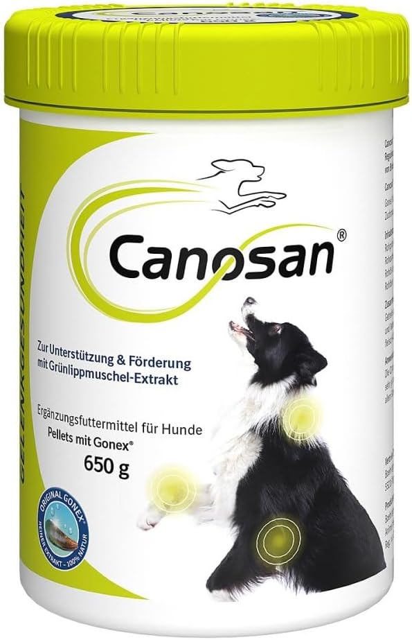 Canosan is a natural supplementary feed for dogs that was specially developed for the regulation and stabilization of the joint and connective tissue metabolism.It is suitable for prophylaxis and effective therapy support for joint diseases.The special properties of Canosan are based on the ingredient Gonex, which contains an active green-lipped mussel extract (GLME) and is rich in different glycosaminoglycans (gags), polyunsaturated fatty acids and special glycogen complexes.Canosan for more joint health in dogs: In every phase of a dog's life phase, various factors act on the sensitive system joint that can damage it.These factors include, for example, genetic, often also breed-related preload for joint diseases, various injury and disease processes, aging processes or the overuse of the joints.Since health problems on the musculoskeletal system are not always clear or not immediately recognizable, you should watch your four -legged companions closely.Canosan for dogs of all sizes and of all ages: With Canosan you give your dog exactly what he or she needs for the health of the joints in every phase of life and life.In the form of the tasty pellets, normal dog food can be added.Canosan is very well tolerated and is suitable for: puppies and young dogs, especially the larger breed to prevent the development of growth disorders.Adult dogs, sports and utilities to prevent the development of signs of wear in the joint.Dogsians to positively influence the age-related wear and disturbed joint and connective tissue metabolism.Dogs with existing movement disorders to positively influence the disturbed joint and connective tissue metabolism. Ingredients ingredients Limited ingredients LEGAL NOTICE You ask your doctor or pharmacist about risks and side effects. Set contains: Canosan concentrate vet Morewith Canosan give your dog exactly what he or she needs for the health of the joints in every phase of life and life.In every phase of life of a dog, various factors act on the sensitive system joint that can damage it.The special properties of Canosan are based on the ingredient Gonex.It is suitable for prophylaxis and effective therapy support for joint diseases.Canosan is a natural supplementary feed for dogs that was specially developed for the regulation and stabilization of the joint and connective tissue metabolism.Canosan ist ein natürliches Ergänzungsfuttermittel für Hunde, das speziell für die Regulierung und Stabilisierung des Gelenk- und Bindegewebsstoffwechsels entwickelt wurde. Es eignet sich sowohl zur Prophylaxe als auch zur effektiven Therapiebegleitung bei Gelenkerkrankungen. Die besonderen Eigenschaften von Canosan beruhen auf dem Inhaltsstoff Gonex, welcher einen aktiven Grünlippmuschel-Extrakt (GLME) enthält und reich an verschieden Glykosaminoglykanen (GAGs), mehrfach ungesättigten Fettsäuren und besonderen Glykogenkomplexen ist. Canosan für mehr Gelenkgesundheit bei Hunden: In jeder Lebensphase eines Hundes wirken verschiedene Faktoren auf das empfindliche System-Gelenk ein, die dieses schädigen können. Zu diesen Faktoren gehören zum Beispiel genetische, oft auch rassebedingte Vorbelastungen für Gelenkerkrankungen, diverse Verletzungs- und Krankheitsprozesse, Alterungsprozesse oder die Überbeanspruchung der Gelenke. Da gesundheitliche Probleme am Bewegungsapparat nicht immer eindeutig bzw. nicht sofort zu erkennen sind, sollten Sie Ihren vierbeinigen Gefährten genau beobachten. Canosan für Hunde jeder Größe und jeden Alters: Mit Canosan geben Sie Ihrem Hund in jeder Lebensphase und Lebenslage genau das, was er oder sie für die Gesundheit der Gelenke benötigt. In Form der schmackhaften Pellets kann zum normalen Hundefutter zugegeben werden. Canosan ist sehr gut verträglich und eignet sich für: Welpen und Junghunde, vor allem der größeren Rasse, um der Entstehung von Wachstumsstörungen vorzubeugen. Ausgewachsene Hunde, Sport- und Gebrauchshunde, um der Entstehung von Abnutzungserscheinungen im Gelenk vorzubeugen. Hundesenioren, um den altersbedingten Verschleiß und gestörten Gelenk- und Bindegewebsstoffwechsel positiv zu beeinflussen. Hunde mit bestehenden Bewegungsstörungen, um den gestörten Gelenk- und Bindegewebsstoffwechsel positiv zu beeinflussen. INHALTSSTOFFE ZUTATEN Begrenzte Zutaten RECHTLICHE HINWEISE Zu Risiken und Nebenwirkungen fragen Sie Ihren Arzt oder Apotheker. SET ENTHÄLT: Canosan Konzentrat vet MehrMit Canosan geben Sie Ihrem Hund in jeder Lebensphase und Lebenslage genau das, was er oder sie für die Gesundheit der Gelenke benötigt. In jeder Lebensphase eines Hundes wirken verschiedene Faktoren auf das empfindliche System-Gelenk ein, die dieses schädigen können. Die besonderen Eigenschaften von Canosan beruhen auf dem Inhaltsstoff Gonex. Es eignet sich sowohl zur Prophylaxe als auch zur effektiven Therapiebegleitung bei Gelenkerkrankungen. Canosan ist ein natürliches Ergänzungsfuttermittel für Hunde, das speziell für die Regulierung und Stabilisierung des Gelenk- und Bindegewebsstoffwechsels entwickelt wurde.Boehringer Ingelheim CANOSAN 650g Konzentrat Vet 650 g (1er Pack)