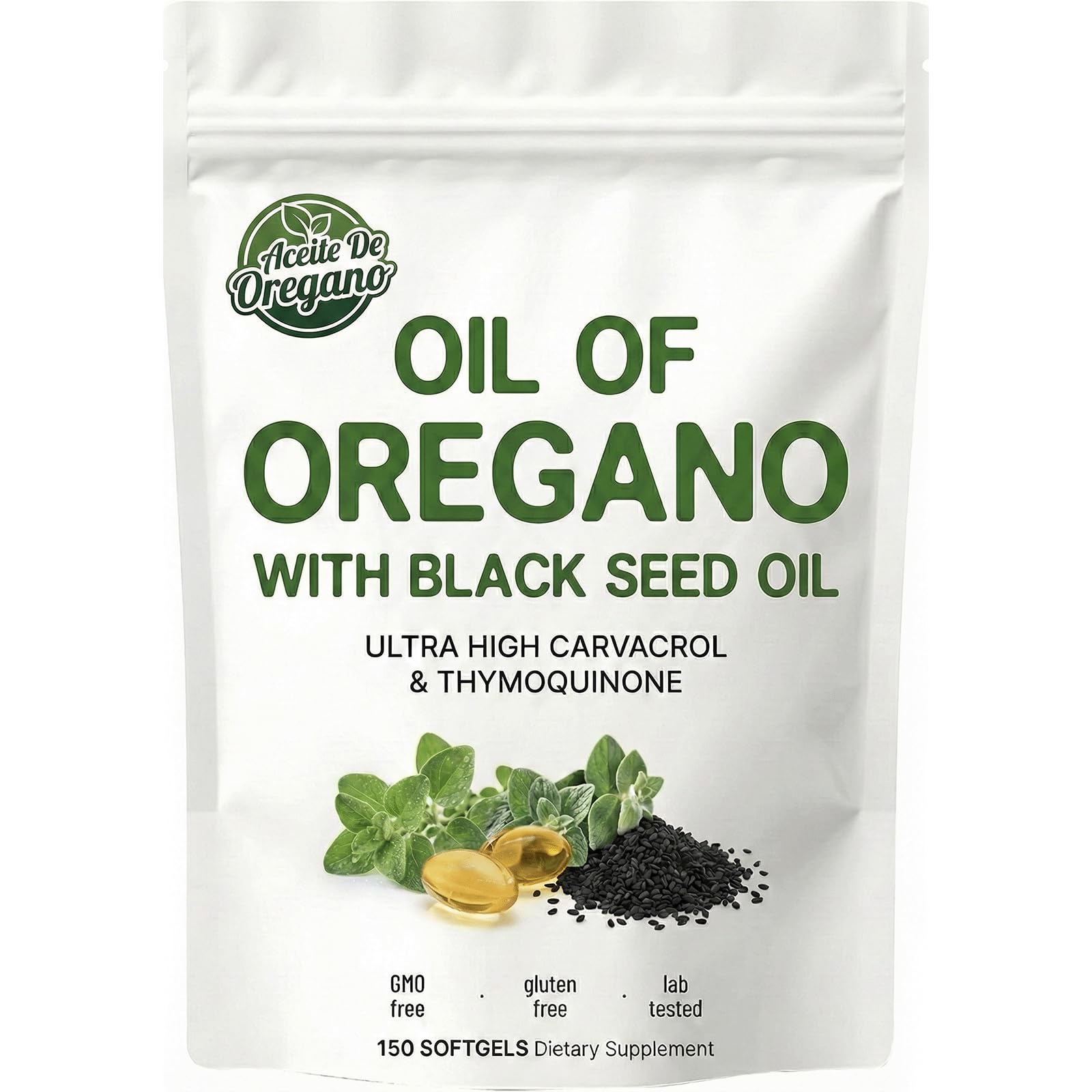 Aceite De Oregano Capsulas, 2 in 1 Formulated with Black Seed Oil, 4X Strength Carvacrol Thymoquinone, Plant Based, Non-GMO,150 Count