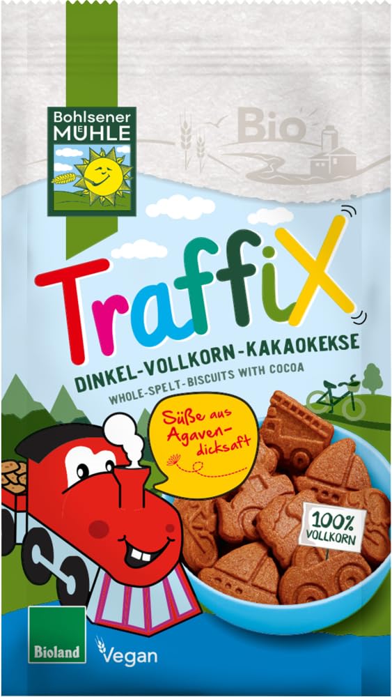 Bohlsener Mühle – TraffiX Whole Grain Cocoa Biscuits – 125 g – Pack of 6 Naturally sweetened with agave juice. No added granulated sugar. With precious whole grain spelt. Formula free of wheat, yeast, egg, and lactose. Driving, sailing, digging, and rolling: for fans of all things that roll and float. With child-friendly riddles on the back of the pack. Bioland quality. The whole grain children's biscuits from the corn mill. Parents want only the best for their offspring. We have the perfect biscuits. INGREDIENTS Spelt flour (62 ), agave juice (27 ), unhardened palm fat , oat flour , high-fat cocoa (2 ), raising agent: sodium bicarbonate, sea salt, vanilla . kbA 1 Spelt is a type of wheat of origin – from controlled organic productionBohlsener Mühle Bio TraffiX Lot de 6 biscuits de kakaoké à grains pleins d'épeautre 125 gDESCRIPTION DU PRODUIT DESCRIPTION DU PRODUIT Bohlsener Mühle – TraffiX Biscuits de cacao à grains complets – 125 g – Lot de 6 ? Sucré naturelle à base de jus d'agave ? Sans ajout de sucre cristallin. Avec épeautre précieux du grain entier ? Formule sans blé, levure, œuf et lactose ? Conduite, voile, pelleteuse et rouler : pour les fans de tout ce qui roule et flotte ? Avec des énigmes adaptées aux enfants à l'arrière de l'emballage ? Qualité Bioland Les biscuits pour enfants à grains complets du moulin à maïs. Les parents ne veulent que le meilleur pour leur progéniture. Nous avons les biscuits assortis. INGRÉDIENTS farine d'épeaux 1(62 ), jus d'agave (27 ), graisse de palmier non durcie , farine d'avoin , cacao fortement huilé (2 ), levure : bicarbonate de sodium, sel de mer, vanille . kbA 1 épeautre est un type de blé d'origine – issu d'une production écologique contrôlée