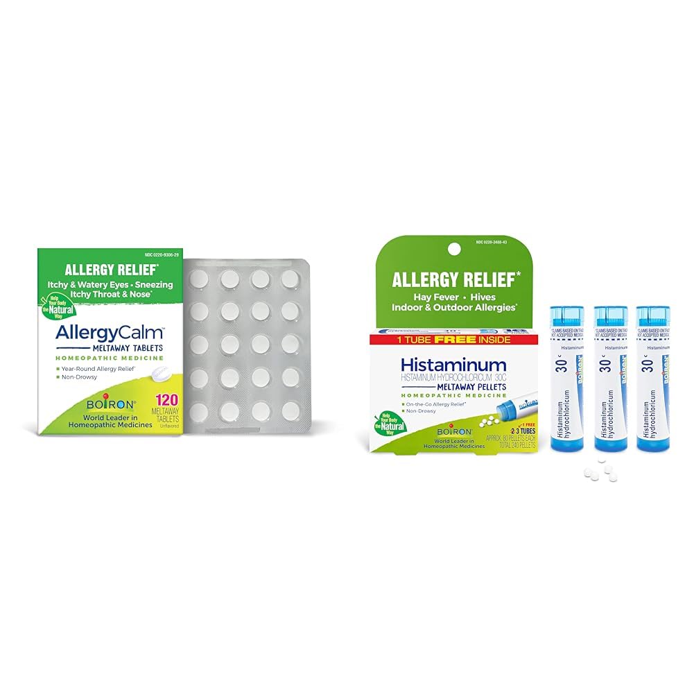 This bundle brings together two complementary Boiron homeopathic allergy relief products to provide comprehensive allergy symptom relief. The first component is AllergyCalm tablets that provide temporary relief from upper respiratory allergy symptoms like itchy, watery eyes, sneezing, runny nose and itchy throat and nose. These non-drowsy quick-dissolving tablets containing highly diluted natural active ingredients are easy to take at the first sign of allergy symptoms. The second component is Histaminum Hydrochloricum 30C pellets for indoor or outdoor allergy relief from hay fever and hives. Like AllergyCalm, it provides non-drowsy relief by targeting allergy symptoms using highly diluted natural substances. These quick-dissolving pellets can also be taken at the first sign of allergy symptoms. With 120 AllergyCalm tablets and 240 Histaminum Hydrochloricum 30C pellets, this bundle offers comprehensive allergy relief for the whole family. The two products work well together - AllergyCalm for general upper respiratory allergy symptoms and Histaminum for more specific hay fever and hive symptoms. With no known side effects or drug interactions, this homeopathic bundle is a safe, effective way to relieve allergy suffering.