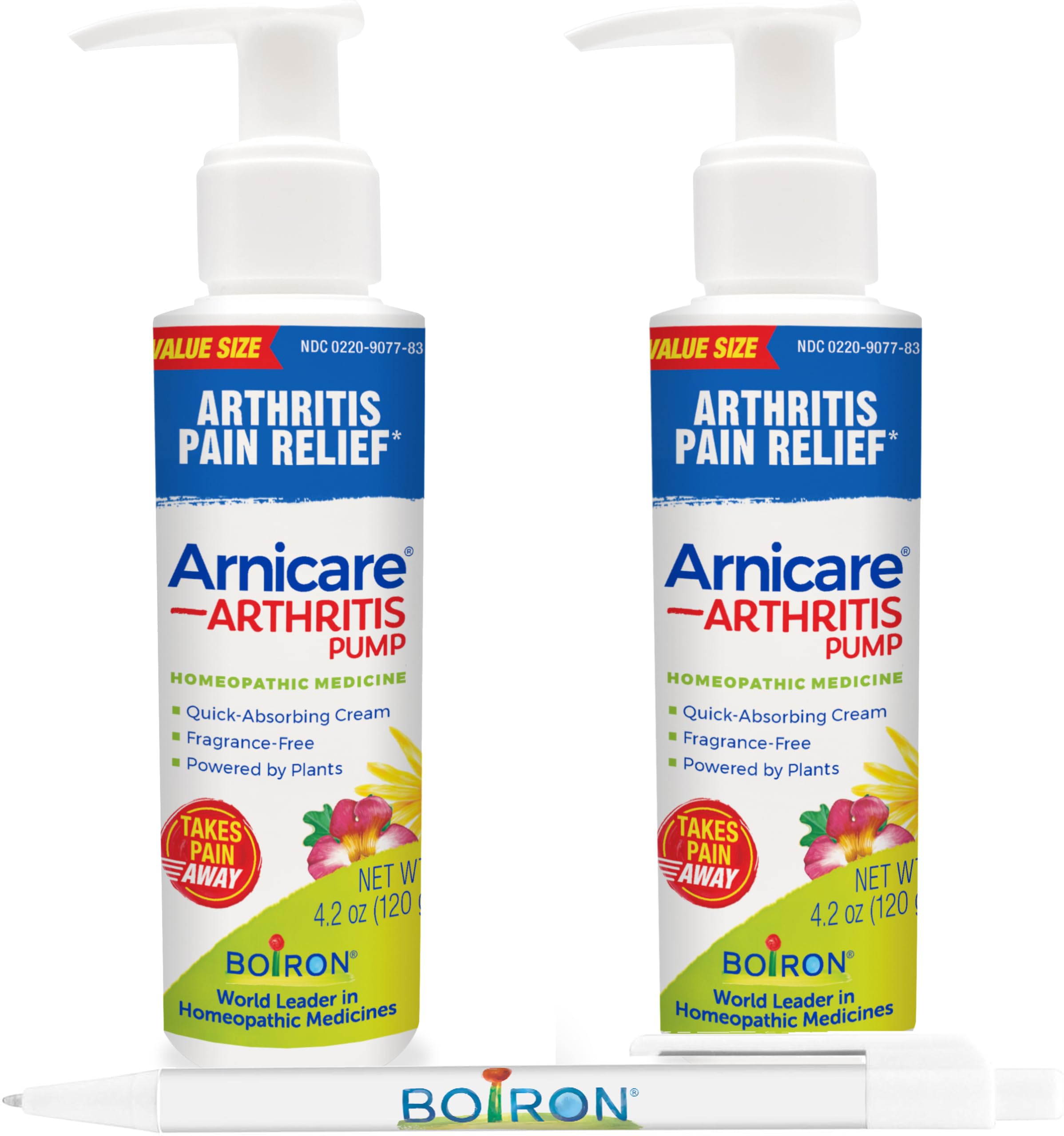 Arnicare Cream by Boiron combines two pain relievers in one convenient formula for dual action pain relief where you need it most. This bundle contains 2 bottles of 4.2oz Boiron's Arthritis Cream plus a Boiron pen to help you keep track of your progress. It's scientifically formulated with Arnica and Harpagophytum (devil's claw), which work together to reduce minor stiffness, soreness, and joint pain of arthritis. This topical is ideal for sudden flare-ups as it quickly absorbs into skin to take away pain at its source. And unlike diclofenac sodium gels, Arnicare Arthritis Cream is suitable for use on all joints and there's no need to measure what you apply. Arnicare Arthritis Cream doesn't contain menthol, camphor, and capsaicin that may burn or sting on application. The fragrance-free formula has no strong medicinal smell and is also dye-free and paraben-free. Recommended for ages 12 and up, Arnicare Arthritis Cream is available over the counter in a 4. 2 oz value-size bottle with pump. Also try Arnicare Arthritis Tablets for general arthritis pain relief. Claims based on traditional homeopathic practice, not accepted medical evidence. Not FDA evaluated.