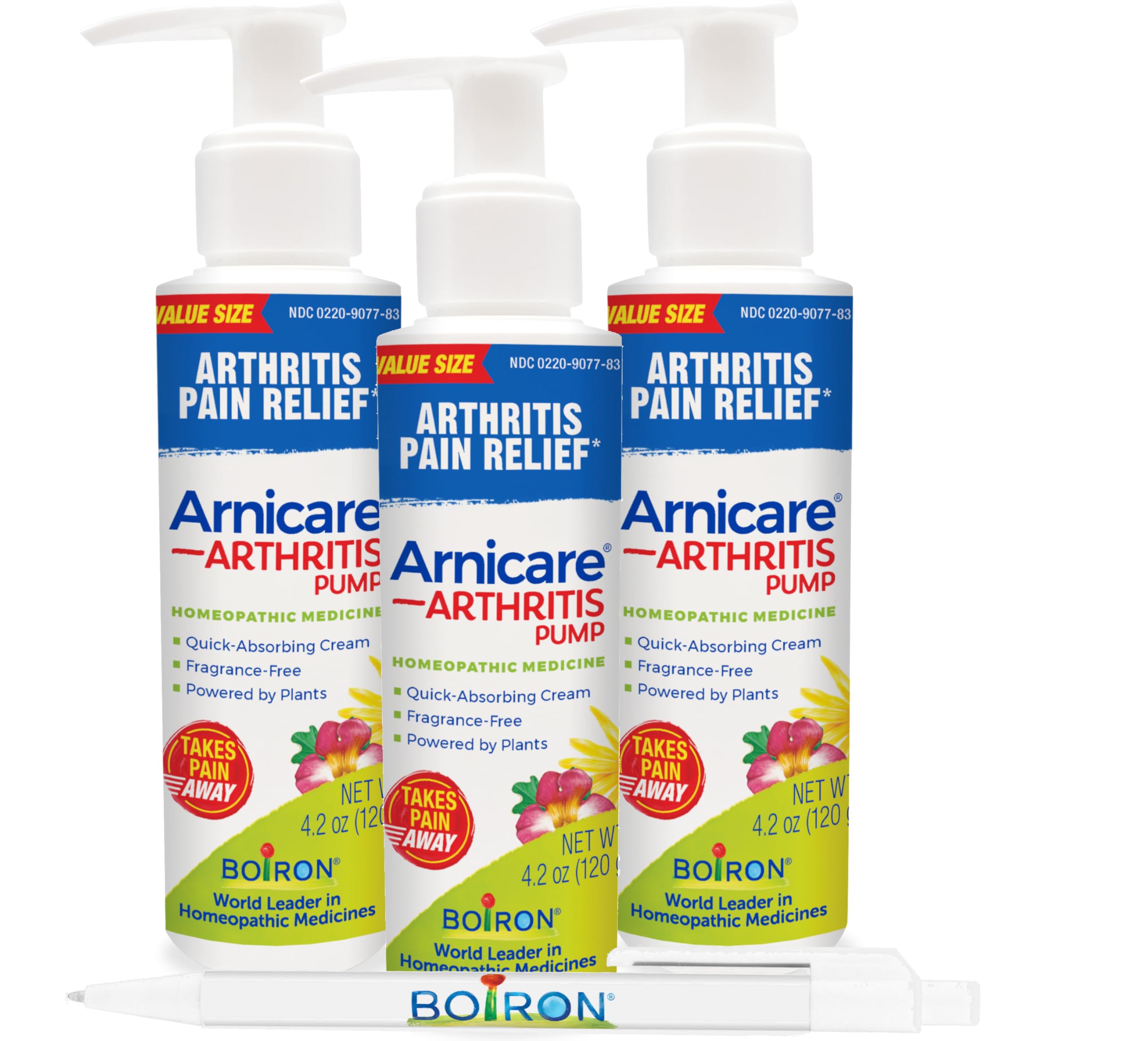 Arnicare Arthritis Cream by Boiron combines two pain relievers in one convenient formula for dual action pain relief where you need it most. This bundle contains 3 bottles of 4.2oz Boiron's Arthritis Cream plus a Boiron pen to help you keep track of your levels of relief before and after. We suggest writing down you pain level before applying the product, then write it down after applying the product. It's scientifically formulated with Arnica and Harpagophytum (devil's claw), which work together to reduce minor stiffness, soreness, and joint pain of arthritis. This topical is ideal for sudden flare-ups as it quickly absorbs into skin to take away pain at its source. And unlike diclofenac sodium gels, Arnicare Arthritis Cream is suitable for use on all joints and there's no need to measure what you apply. Arnicare Arthritis Cream doesn't contain menthol, camphor, and capsaicin that may burn or sting on application. The fragrance-free formula has no strong medicinal smell and is also dye-free and paraben-free. Recommended for ages 12 and up, Arnicare Arthritis Cream is available over the counter in a 4. 2 oz value-size bottle with pump. Also try Arnicare Arthritis Tablets for general arthritis pain relief. Claims based on traditional homeopathic practice, not accepted medical evidence. Not FDA evaluated.