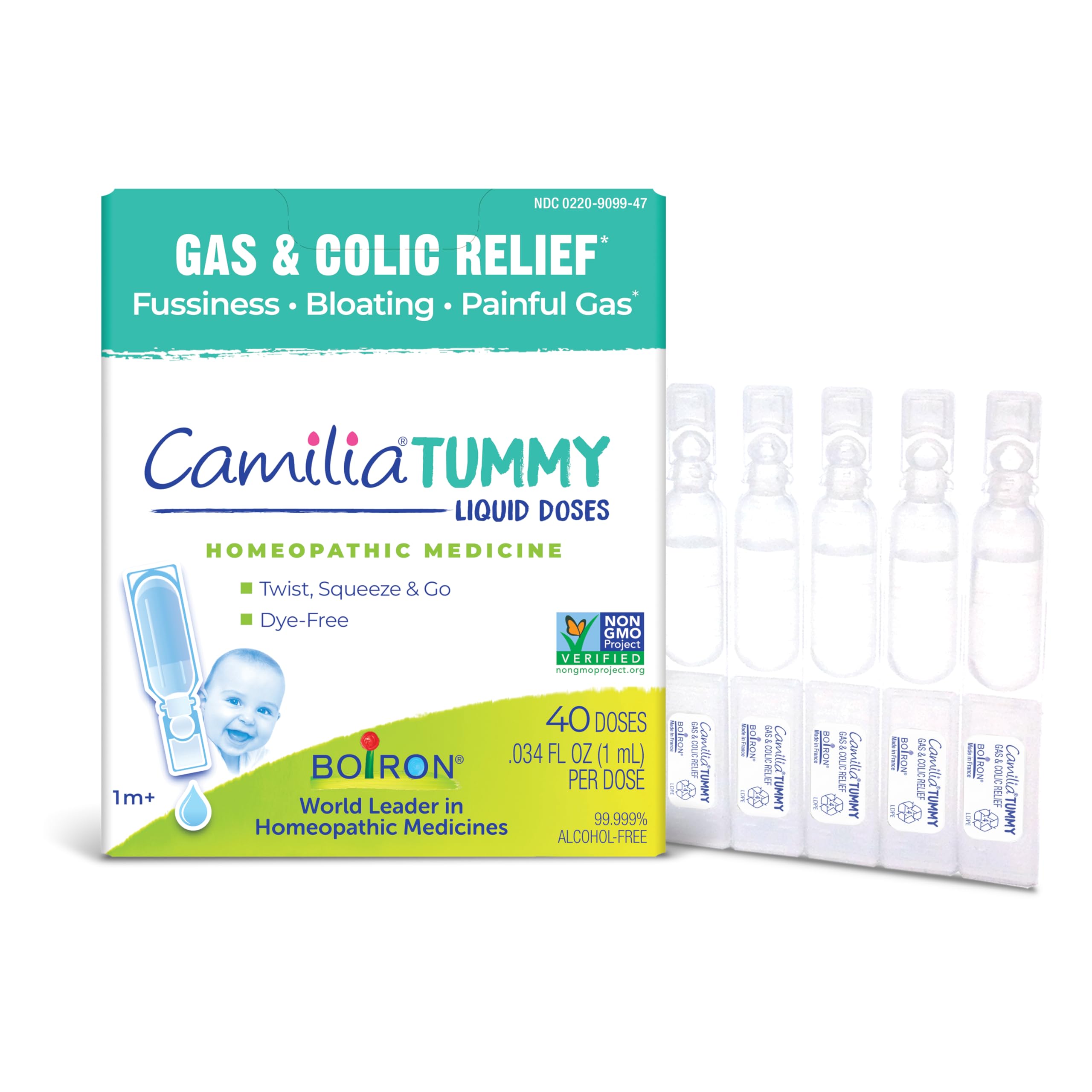 HSA FSA ELIGIBLE: Camilia Tummy Liquid Doses are HSA FSA eligible. A TRUSTED BRAND: With more than 90 years of expertise, Boiron medicines are manufactured to meet the highest standards of cGMP and HPUS for purity and quality. A BETTER WAY TO FEEL BETTER: Camilia Tummy is a homeopathic colic and gas relief medicine for babies 1 month that has no known interactions with other medications or supplements. It's made with verified non-GMO pure active ingredients and free of dyes, preservatives, artificial sweeteners, and flavors. EASY TO GIVE MESS-FREE: Camilia Tummy's liquid doses allow you to simply twist, squeeze and go without the need to measure. This medicine is clear, tasteless, and absorbed in the mouth. Plus, the doses are sterile, hygienic, and do not require refrigeration. GENTLE, HOMEOPATHIC BABY GAS COLIC DROPS: Camilia Tummy by Boiron, with pure non-GMO ingredients like chamomile, provides gentle relief for tummy pain, bloating, fussiness, crying, and excessive or painful gas caused by gas or colic. .