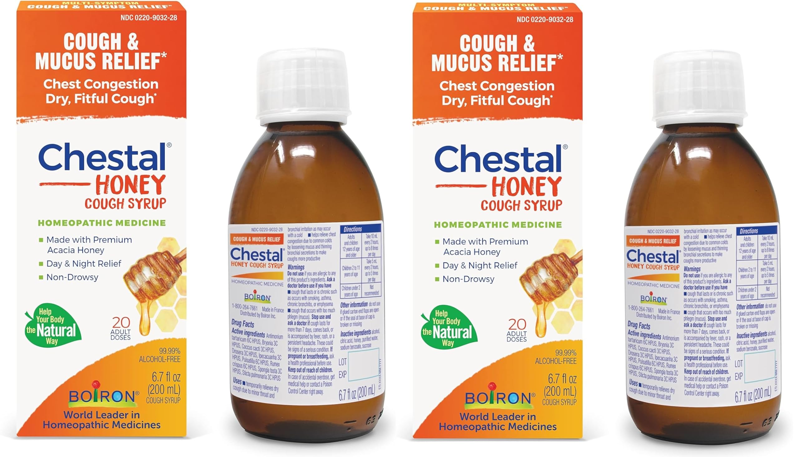 A BETTER WAY: At Boiron, we believe there's a better way to feel better. Since 1932, the Boiron family has been dedicated to providing the purest medicines using sustainable practices. As world leader in homeopathic medicines, quality has always been our passion and you well-being is our goal. HELP YOUR BODY THE NATURAL WAY: Homeopathic medicine uses highly diluted biological, botanical, or mineral substances to relieve symptoms. Our cough syrups work with your body without the risk of contraindications, or known drug interactions. FOR THE WHOLE FAMILY: Recommended for everyone ages 2 and up, Chestal Honey is available for both adults and children in 6.7 fl oz bottles. DAY NIGHT RELIEF: Chestal Honey is your day and night solution, calming those dry, fitful coughs at bedtime, so they don't prevent sleep, but without drowsy side effects for the day. RELIEF FOR COUGH CHEST CONGESTION: Chestal Honey is made with a blend of homeopathic active ingredients and 100 premium Acacia honey to that work to relieve all types of common coughs and loosen chest congestion. . Pack of 2.