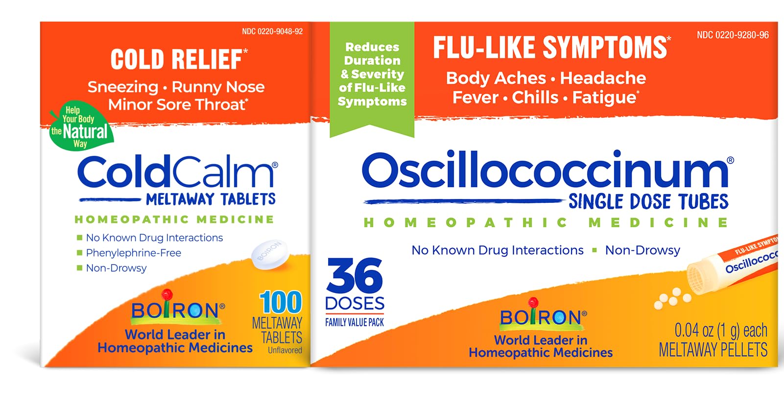 BUNDLE: (1) Box of Cold Calm 100 Tablets and (1) Box of Oscillococcinum 36 Single Serving Tubes Available in quick-dissolving tablets and pellets. ? Boiron cough, cold and flu medicines do not cause drowsiness or sleeplessness ? Homeopathic Medicine Women and Men ? No known interactions with other medications COLD CALM MELTAWAY TABLETS 100 COUNT - NON-DROWSY ✓ For Relief of Common Cold Symptoms Such as Sneezing, Runny Nose, Minor Sore Throat, and Nasal Congestion ✓ Coldcalm Melt Away Tablets address symptoms at every stage of a cold ✓ Recommended for everyone ages 3 and up. OSCILLO PELLETS - 36 SINGLE DOSE TUBES ✓ For Relief from Flu-Like Symptoms of Body Aches, Headache, Fever, Chills, and Fatigue. ✓ Take at the first sign of flu-like symptoms. ✓ Ideal for ages 2 and up. SUGGESTED USAGE: ? At the onset of symptoms, dissolve 2 ColdCalm tablets in the mouth every 15 minutes for 1 hour. Then, take 2 tablets every 6 hours. Decrease frequency with improvement. ? At the onset of symptoms, dissolve entire contents of 1 Oscillococcinum tube in the mouth every 6 hours, up to 3 times a day. For children, see box for specific instructions. ABOUT BOIRON "Your health deserves the greatest respect. Since 1932, the Boiron family has been committed to providing quality medicines. As world leader in homeopathy, our passion is your health. Our promise is your satisfaction." Add to your cart today because you deserve to make your health a priority. Good for the Whole Family. Also available in sizes: 6, 12, 30, and 60 count. Help Your Body the Natural Way.HSA FSA eligible: ColdCalm and Oscillococcinum are HSA FSA eligible. NON-DROWSY: Boiron cough, cold and flu medicines do not cause drowsiness or sleeplessness. SHORTEN YOUR SYMPTOMS: Oscillo has been shown in clinical studies to help reduce both the duration and the severity of flu-like symptoms when taken at the onset. . HOMEOPATHIC FLU RELIEF: Oscillococcinum works with your body to help relieve body aches, headache, fever, chills, and fatigue. Ideal for ages 2 and up. COLD CALM TABS: For Relief of Common Cold Symptoms Such as Sneezing, Runny Nose, Minor Sore Throat, and Nasal Congestion. Non-Drowsy. Ideal for ages 3 and up. HOW TO TAKE: At the onset of symptoms, dissolve in your mouth. See box for full directions. BUNDLE: Cold Calm 100 Quick Dissolving Tablets and Oscillococcinum 36 Doses.