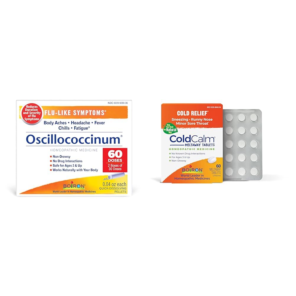 Boiron Oscillococcinum for Relief from Flu-Like Symptoms of Body Aches, Headache, Fever, Chills, and Fatigue - 60 Count (2 Pack of 30) Oscillo 60 Doses Boiron ColdCalm Tablets for Relief of Common Cold Symptoms Such as Sneezing, Runny Nose, Sore Throat, and Nasal Congestion - Non-Drowsy - 60 Count Boiron ColdCalm tablets target specific cold symptoms at the onset, established and resolution stages of the common cold. This homeopathic cold relief medicine is easy to take at first sign to relieve sneezing, runny nose, nasal congestion, and minor sore throat pain. The tablets dissolve quickly under the tongue without water, chewing, or swallowing pills. It's non-drowsy and does not interact with other medications or supplements. ColdCalm homeopathic medicine is not habit-forming and there's no risk of a rebound. It won't mask symptoms of a more serious condition. Recommended for everyone ages 3 and up, it's available over the counter in a box of 60 unflavored tablets. The ColdCalm line includes slightly sweet melt-away pellets for children and liquid doses for babies. Also try Oscillococcinum for flu symptoms and the Chestal cough syrup line.