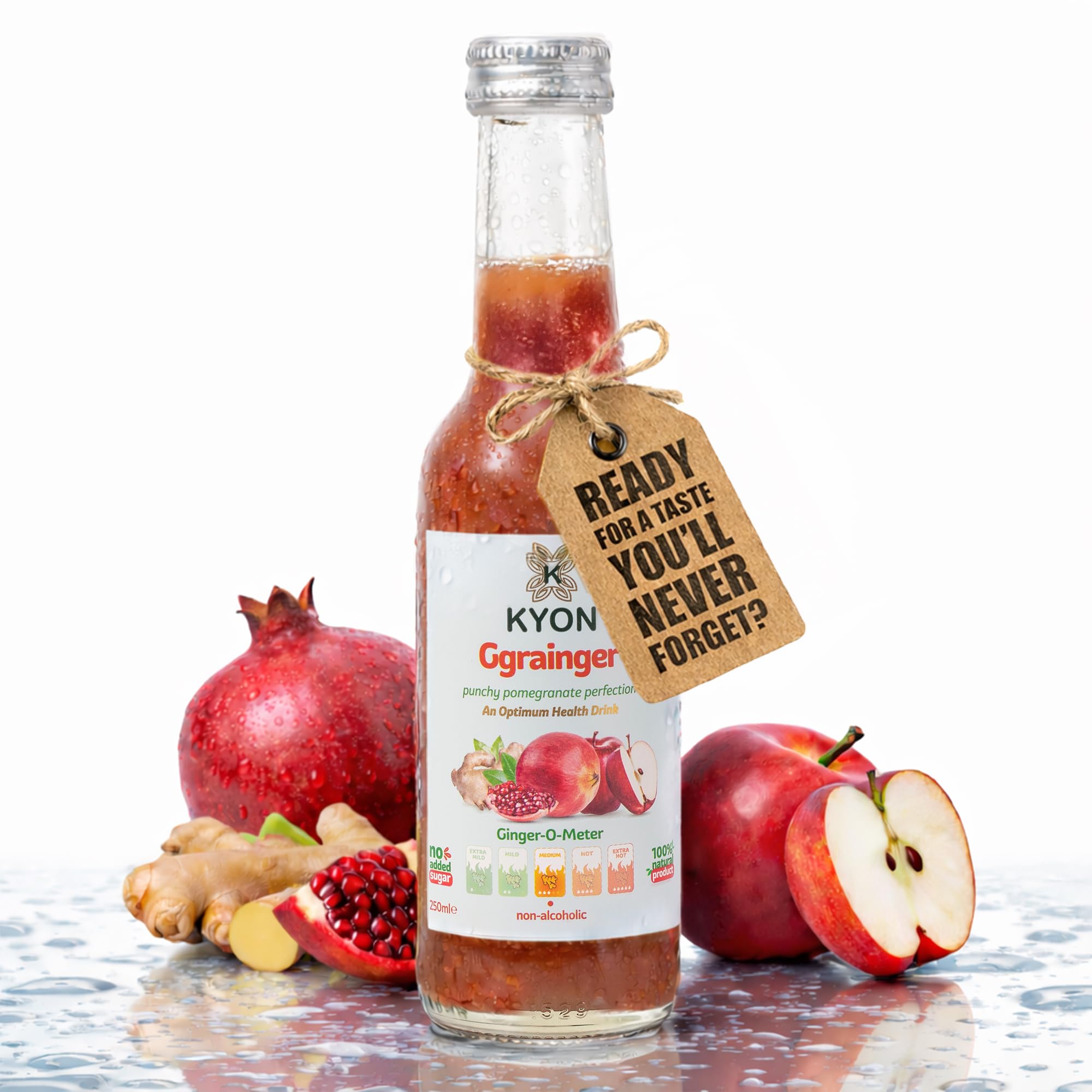 Boisson Kyon Ggrainger – Jus de gingembre 250 ml à la grenade, à la pomme et au citron. Boisson rafraîchissante et sans alcool, disponible en packs de 6.