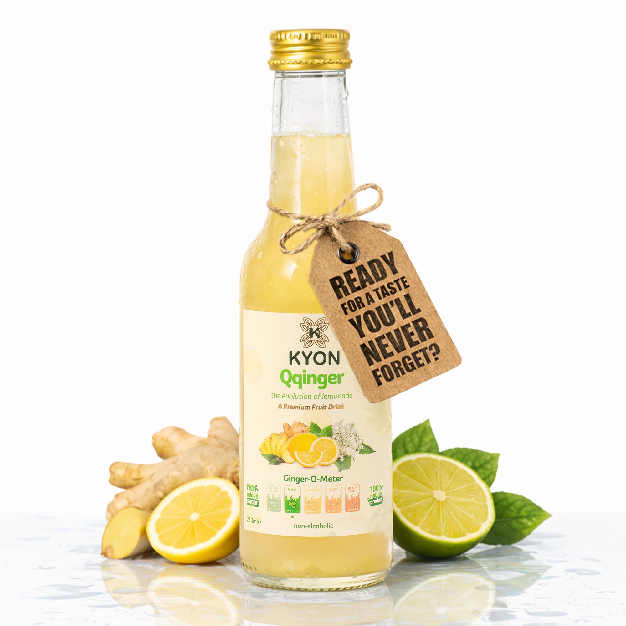 Qqinger (pronounced Kin-jer) is the lighter, more refreshing version of Kyon's ginger range. Designed as a naturally thirst-quenching alternative to sugary, fizzy sodas, this ginger drink combines fresh, organic ginger from Peru and Costa Rica with lemon, lime, and elderflower to create a smooth and refreshing ginger lemonade. Cloudy in color and with a subtle ginger aroma, Qqinger hints at its vibrant, fruity, and citrusy flavor. Naturally rich in vitamin C, it boosts the immune system and contains only natural fruit sugars, with no artificial sweeteners, flavors, or preservatives. Gently heated to preserve its freshness and ensure a 12-month shelf life, this gluten-free and vegan drink is carefully crafted from 100 natural ingredients. Each 250ml bottle is perfect for mocktails. Serve it chilled to quench your thirst, enjoy it neat, or mix it into simple mocktails. It separates naturally, so just shake well before pouring for a smoother, creamier ginger experience.CONVENIENT 250ML BOTTLES – Presented in elegant 250ml glass bottles and available in packs of 6, 12, and 24, Qqinger Lemonade is perfect for lunches, gifts, parties, or simply for having a naturally energizing drink on hand. Shake well before use to release all the aromas. ENJOY CHILLED OR IN A COCKTAIL – Best served chilled, this healthy ginger lemonade can be enjoyed neat, over ice, or in light, non-alcoholic cocktails. A deliciously irresistible drink that refreshes, hydrates, and elevates everyday life. GINGER SCALE – MILD – Classified as MILD on the ginger scale, Qqinger Lemonade offers a gentle warmth and the antioxidant benefits of ginger, ideal for those who prefer a lighter, more refreshing ginger flavor. REAL GINGER AND CITRUS – Made with fresh organic ginger, lemon, lime, and fragrant elderflower, this herbal ginger drink offers a naturally sweet, pure, and tangy flavor that's easy to drink from the first sip to the last. A DELICIOUSLY REFRESHING ALCOHOL-FREE EXPERIENCE – Qqinger is a perfectly balanced ginger lemonade, ideal for those who want the flavor without the alcohol. Light, citrusy, and thirst-quenching, each sip delivers freshness and depth without bubbles or artificial sugar.Qqinger (prononcé Kin-jer) est la version plus légère et rafraîchissante de la gamme de gingembre Kyon. Conçue comme une alternative naturellement désaltérante aux sodas sucrés et gazeux, cette boisson au gingembre associe du gingembre bio frais du Pérou et du Costa Rica à du citron, du citron vert et des fleurs de sureau pour créer une limonade au gingembre douce et rafraîchissante. D'une couleur trouble et au subtil arôme de gingembre, Qqinger laisse présager la vivacité de son goût fruité et citronné. Naturellement riche en vitamine C, elle renforce le système immunitaire et ne contient que des sucres de fruits naturels, sans édulcorants, arômes ni conservateurs artificiels. Légèrement chauffée pour préserver sa fraîcheur et garantir une durée de conservation de 12 mois, cette boisson sans gluten et végétalienne est élaborée avec soin à partir d'ingrédients 100 naturels. Chaque bouteille de 250 ml est idéale pour vos mocktails. Servez-la fraîche pour étancher votre soif, dégustez-la pure ou mélangez-la à de simples mocktails. Se séparant naturellement, il suffit de bien agiter avant de verser pour une expérience gingembre plus douce et onctueuse.BOUTEILLES DE 250 ML PRATIQUES À EMPORTER – Présentée dans d'élégantes bouteilles en verre de 250 ml et disponible en packs de 6, 12 et 24, la limonade Qqinger est parfaite pour les déjeuners, les cadeaux, les réceptions ou pour avoir toujours une boisson naturellement énergisante à portée de main. Bien agiter avant utilisation pour libérer tous les arômes. À DÉGUSTER FRAIS OU EN COCKTAIL – Servie de préférence fraîche, cette limonade saine au gingembre se déguste pure, sur glace ou en cocktails sans alcool légers. Une boisson délicieusement irrésistible qui rafraîchit, hydrate et sublime le quotidien. ÉCHELLE DE GINGEMBRE – DOUX – Classée dans la catégorie DOUX sur l'échelle de gingembre, la limonade Qqinger offre une douce chaleur et les bienfaits antioxydants du gingembre, idéale pour ceux qui préfèrent une saveur gingembre plus légère et rafraîchissante. DU VRAI GINGEMBRE ET DES AGRUMES – Élaborée à partir de gingembre bio frais, de citron, de citron vert et de fleur de sureau parfumée, cette boisson au gingembre aux plantes offre une saveur naturellement douce, pure et acidulée, facile à boire de la première à la dernière gorgée. UNE EXPÉRIENCE DÉLICIEUSEMENT RAFRAÎCHISSANTE SANS ALCOOL – Qqinger est une limonade au gingembre parfaitement équilibrée, idéale pour ceux qui recherchent la saveur sans l'alcool. Légère, citronnée et désaltérante, chaque gorgée offre fraîcheur et profondeur sans bulles ni sucre artificiel.Boisson Kyon Qqinger – Jus de gingembre 250 ml avec citron, citron vert et fleur de sureau, boisson rafraîchissante et sans alcool, disponible en packs de 6