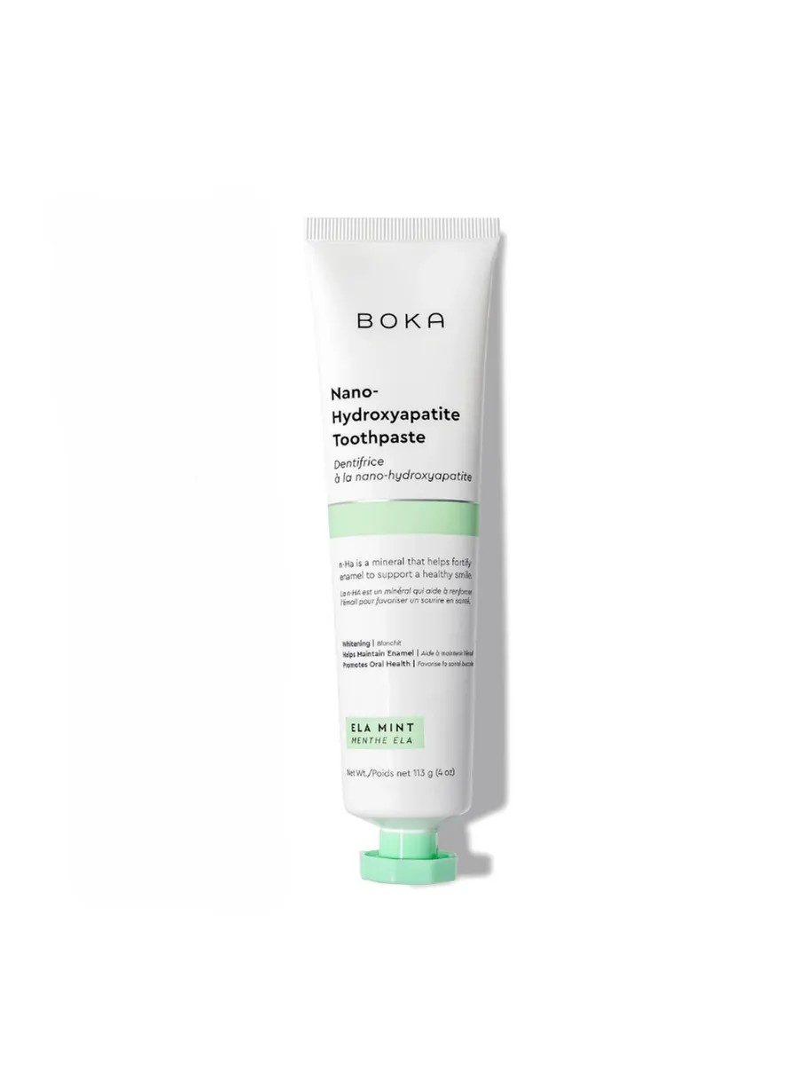 Зубная паста Boka не похожа ни на одну другую зубную пасту. В ней фтор заменён на наногидроксиапатит (n-Ha) — инновацию в стоматологии, которая уже более 40 лет является золотым стандартом в Японии. n-Ha составляет основу зубов и костей, а значит, он естественным образом восстанавливает их и помогает снизить чувствительность. Кроме того, он на 100% биосовместим и нетоксичен. Этот мощный ингредиент дополнен успокаивающим алоэ вера, ксилитом, который борется с бактериями, богатым антиоксидантами зелёным чаем и освежающей мятой.