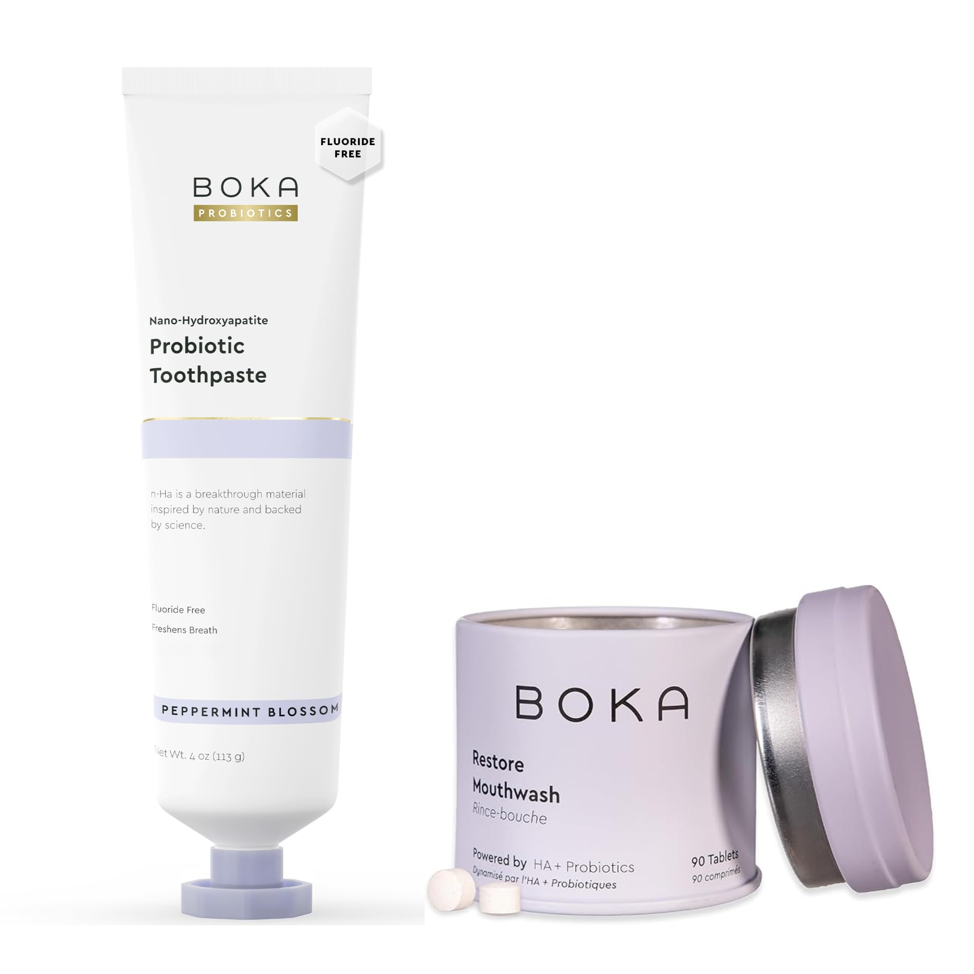 INSTANTLY FRESHEN YOUR BREATH - An innovative and convenient addition to your oral care that freshens breath quickly and supports a healthy oral microbiome. Probiotic Powder is appropriate for sensitive teeth. Enjoy the tingle and know it's working. PEPPERMINT BLOSSOM CALM: Calm and soothe with a blend of peppermint and spearmint that dances with floral ylang ylang. APPROPRIATE FOR SENSITIVE TEETH: Gentle yet effective, Boka's probiotic toothpaste provides a soothing and refreshing experience for the whole family. A fluoride free toothpaste kids and adults can rely on for clean oral care. PROBIOTIC POWER FOR ORAL WELLNESS: Boka nano hydroxyapatite toothpaste is formulated with clinically researched Dental-Lac probiotics, to support the oral microbiome. Ideal dental probiotics for women, probiotic for men, and anyone seeking a healthier smile. ENAMEL CARE: Our proprietary and innovative formula includes Nano-hydroxyapatite (n-Ha) - a biomimetic mineral form of the same ingredient that naturally makes up 97 of your teeth material and 70 of your dentin. n-Ha has been the subject of significant research for decades with a wide variety of potential benefits across dentistry and oral care.