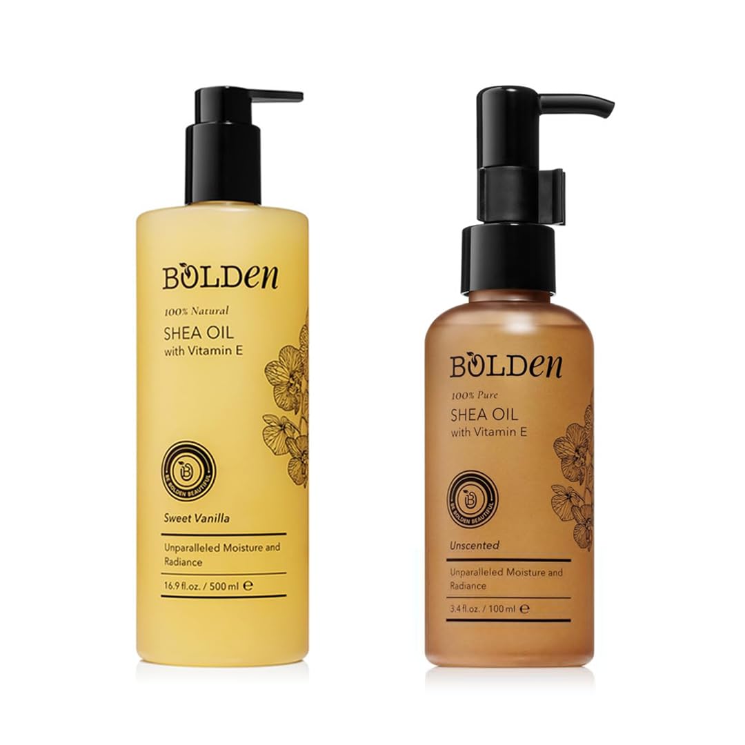BOLDEN Shea Oil Bundle 100% Natural Unscented (3.4 fl oz) & Sweet Vanilla Scented (16.9 fl oz) with Vitamin E for Skin & Hair | Deep Moisture & Radiance for All Skin Types