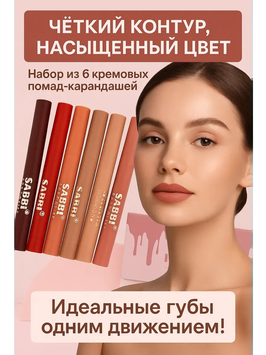 Используй оттенки по отдельности или комбинируй — для омбре-эффекта, выразительного макияжа или нежного нюдового образа. Помады легко сочетаются с карандашом и блеском.