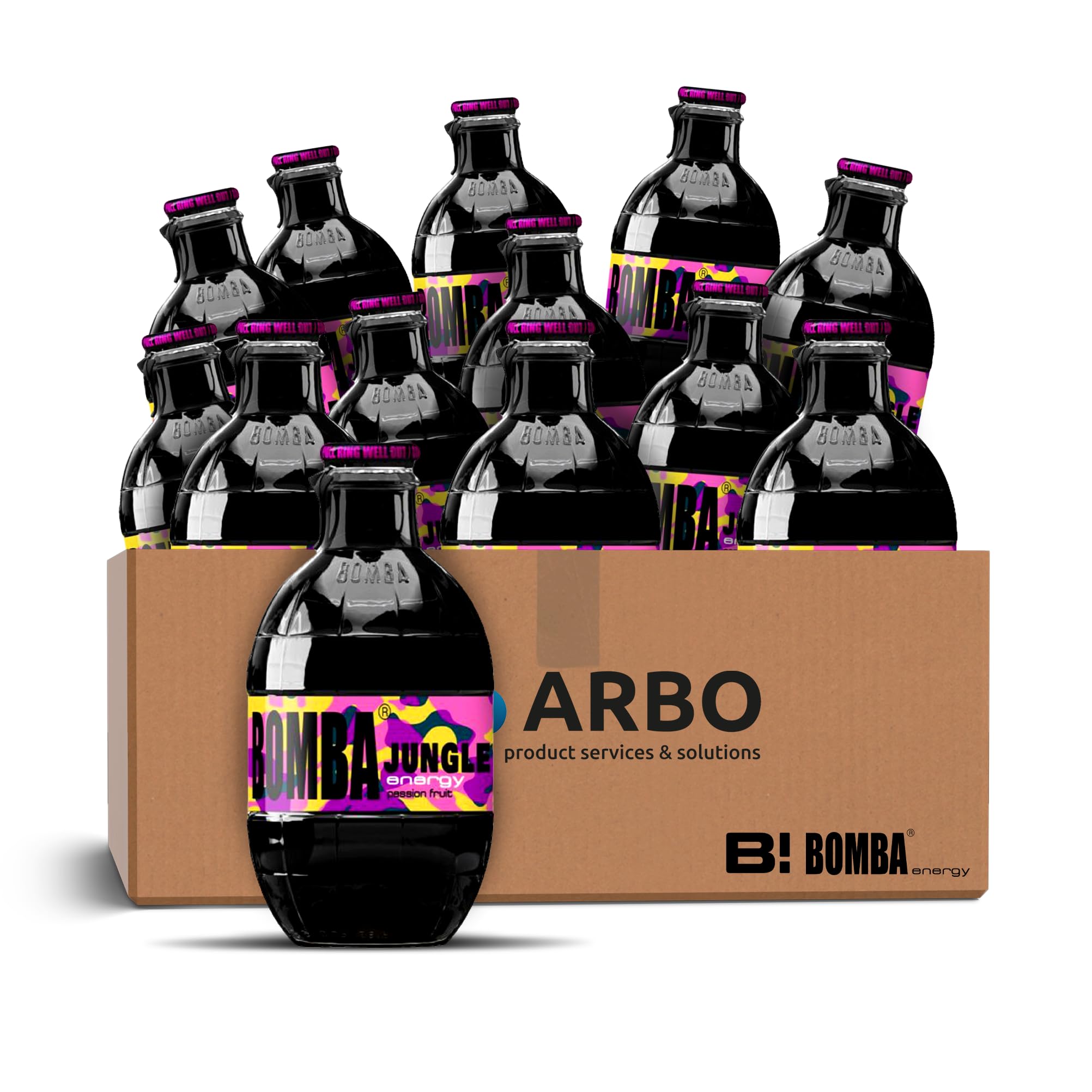Bomba energy drink Jungle passion fruit 12 x 250 ml soft drink in stylish glass bottle in 12pack + ArBoLiving sticker
