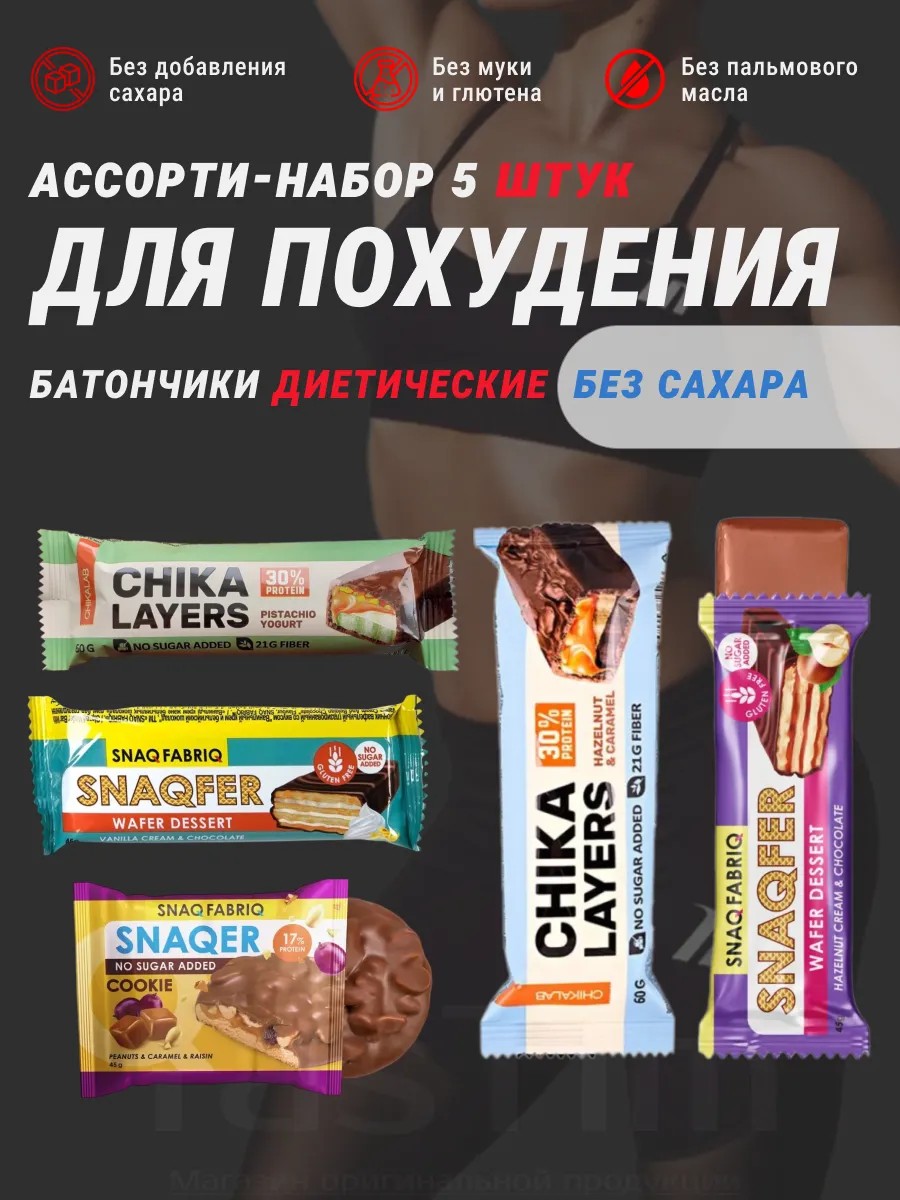| Комплектация | фитнес батончик ( вафля ) для похудения от снэк фабрик (фундучный крем ) - 1шт; протеиновая вафля для диеты низкоуглеводная ( ванильный крем - 1 шт); протеиновое печенье вкусное ( изюм / арахис ) - 1шт; Протеиновый батончик без сахара низкокалорийное chika layers - 1шт; Батончик для здорового перекуса 60гр - чика лаерс фисташковый йогурт - 1шт |