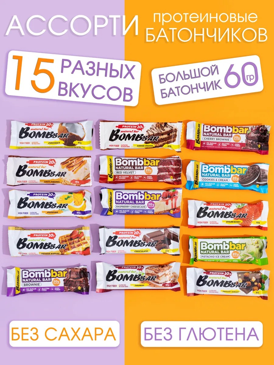 Упаковка из 15 батончиков ассорти. Вы получаете набор протеиновых батончиков из 15 штук разного вкуса. В состав набора входят следующие вкусы: Брауни, Красный бархат, Вишневый брауни, Венские вафли, Двойной шоколад, Кокос, Печенье-крем, Соленая карамель, Фисташковый пломбир, Шоколад-фундук, Датский бисквит, Малиновый чизкейк, Черничный панкейк, Клубника, Тирамису, Пудинг Манго. Подробно с кбжу и составом каждого вкуса вы можете ознакомиться в галерее фото. Для тех кто любит спорт. Наши батончики идеальны для спортсменов до или после тренировки. Большое количество белка - 20 грамм будет способствовать полноценному восстановлению после тренировки. Наши батончики можно отнести к категории спортивного питания. Для тех, кто следит за своей фигурой. Если вы придерживаетесь норм здорового питания, то, наверняка стараетесь включать в рацион обогащенные белком продукты. Наши протеиновые батончики помогут вам добрать необходимое количество белка. Здоровая замена сладкому. Протеиновый батончик Бомббар поможет вам утолить голод и тягу к сладкому.
