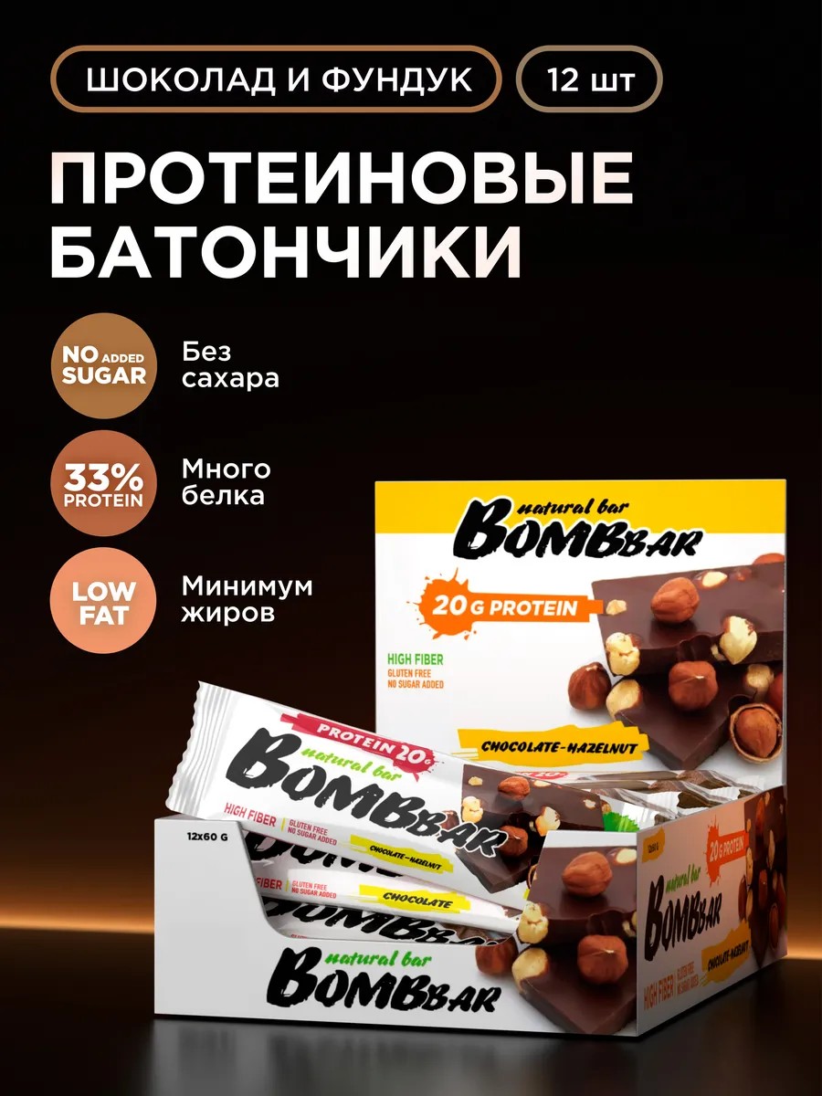 BombBar Протеиновые батончики без сахара Шоколад и фундук, 12шт 60г