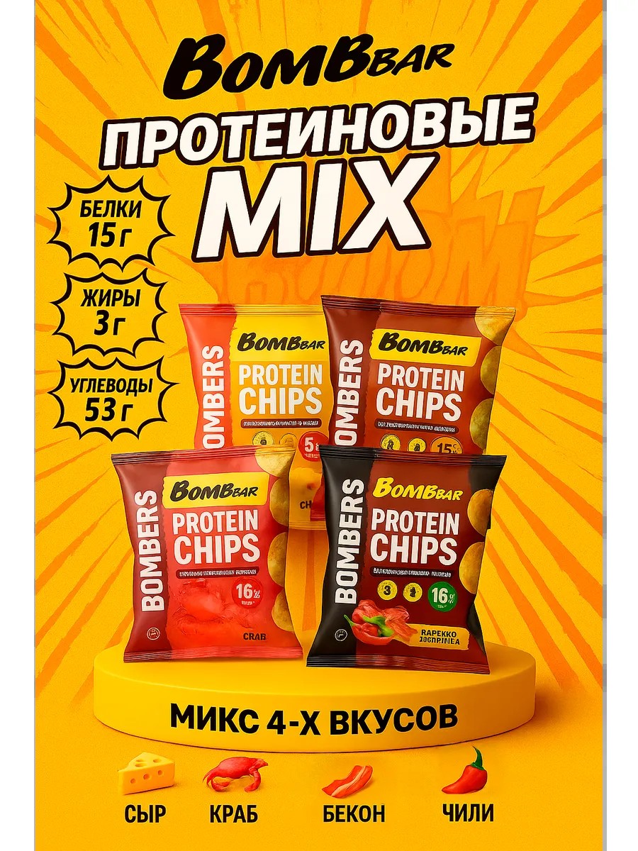 BombBar Протеиновые чипсы MIX 4 вкуса Сыр, Краб, Бекон, Чили