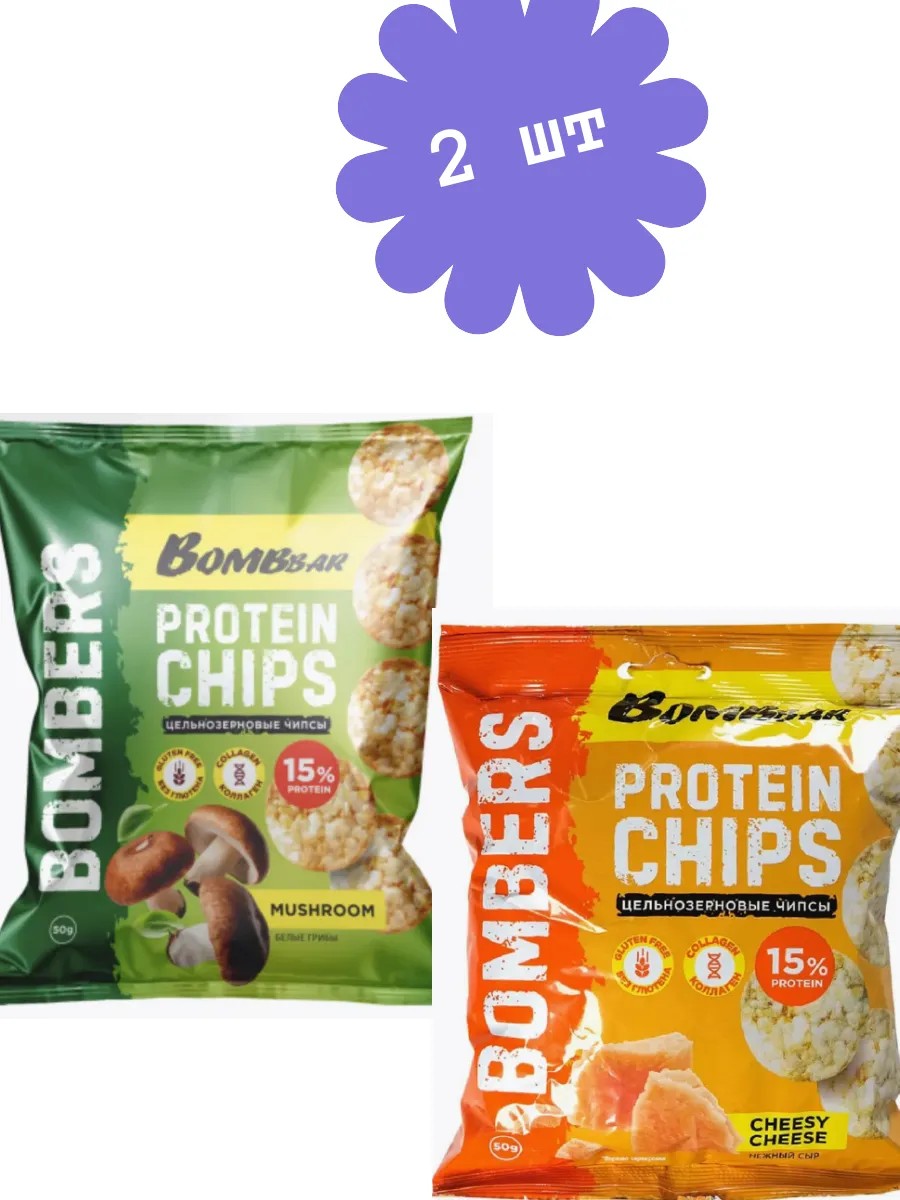| Комплектация | Протеиновые чипсы цельнозерновые Сыр; протеиновые чипсы белые грибы |
