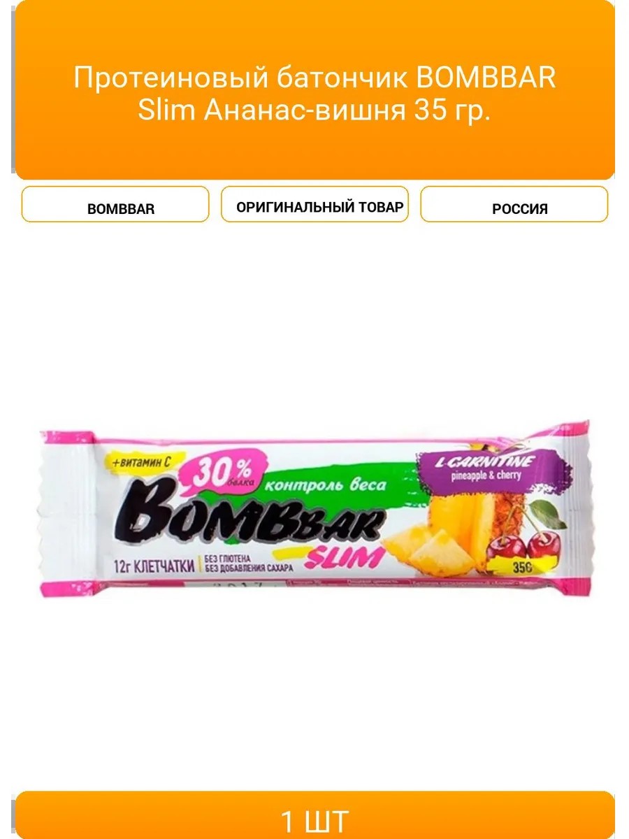 | Комплектация | Протеиновый батончик BOMBBAR Slim Ананас-вишня 35 гр |