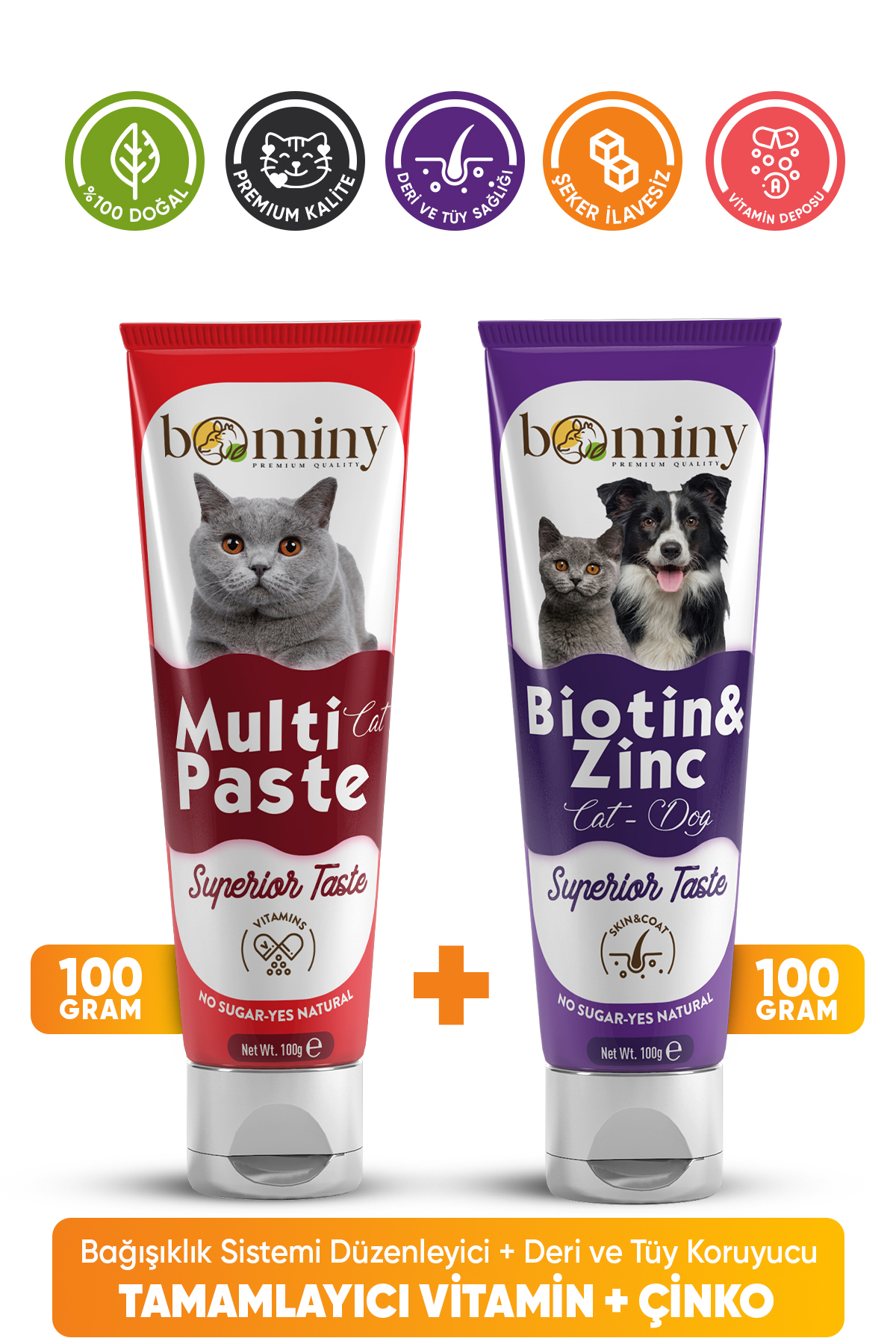 BAGISIKLIK SISTEMINI DESTEKLEYEN 13 ÖNEMLI VITAMIN IÇERIR.Kediler için taurin, mannan oligosaccharide (MOS), vitamin ve mineral içeren tamamlayici yem. Metabolik gelisimi hizlandiran vitaminler sayesinde deri ve tüy sagligi yanisira enerji ve canlilik kazandirir. Ayrica taurin'in göz ve kalp, MOS 'un sindirim sistemini destekleyici etkisi ile kediler için spesifik bir kombine vitamin ve mineral destegidir. Tamamlayici yem ürünüdür. MultiPaste Cat içeriginde bulunan taurin göz ve kalp fonksiyonlarini destekler. E Vitamini: Iyi bir antioksidandir, yasli kedilerde bagisiklik sistemini güçlendirir, hücre yenilenmesine yardimci olur. B2 Vitamini: Tüy dökülmesini yavaslatir, yavru kedilerin büyümesini hizlandirir. B12 Vitamini: Sinir hücrelerini korur, hafizayi güçlendirir. B7: Tüy dökülmesini yavaslatir, tirnaklarin dayanikliligini artirir. Maya tür evi MOS (Mannan-oligosaccharide) içerir. Diyet lifler bagirsak sagligi için önemlidir. Özel içerikleri sayesinde güçlendirici etki saglar, deri sagligini korur kedinizin kendini iyi hissetmesini saglar. A Vitamini: Görme yetenegini güçlendirir, cildin ve tüylerin saglikli kalmasina yardimci olur. BIOTIN ZINC 100 GR: Kedi ve köpekler için Biotin, Çinko, mannan oligosaccharide (MOS), vitamin ve mineral içeren tamamlayici yem.