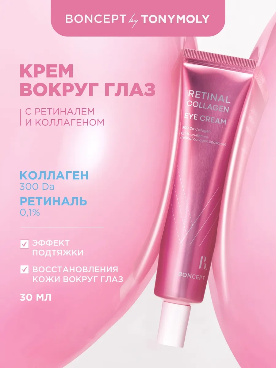 Boncept Retinal Collagen Eye Cream — это крем для глаз объемом 30 мл, который обеспечивает эффект подтяжки и восстановления кожи вокруг глаз. Формула крема содержит ретиналь, заключённый в липосомы коллагена, что обеспечивает комплексный уход и улучшает упругость кожи. В состав входят коллаген с низкой молекулярной массой (300Da) и 0,1% ретиналь-коллаген, которые способствуют стимуляции выработки коллагена и борьбе с провисающими морщинами. Низкомолекулярный коллаген глубоко проникает в кожу, улучшая её упругость и эластичность. Экстракт центеллы укрепляет барьерные функции кожи и оказывает успокаивающее действие, а пантенол увлажняет и успокаивает. Гиалуроновая кислота обеспечивает глубокое увлажнение и поддерживает эластичность кожи.