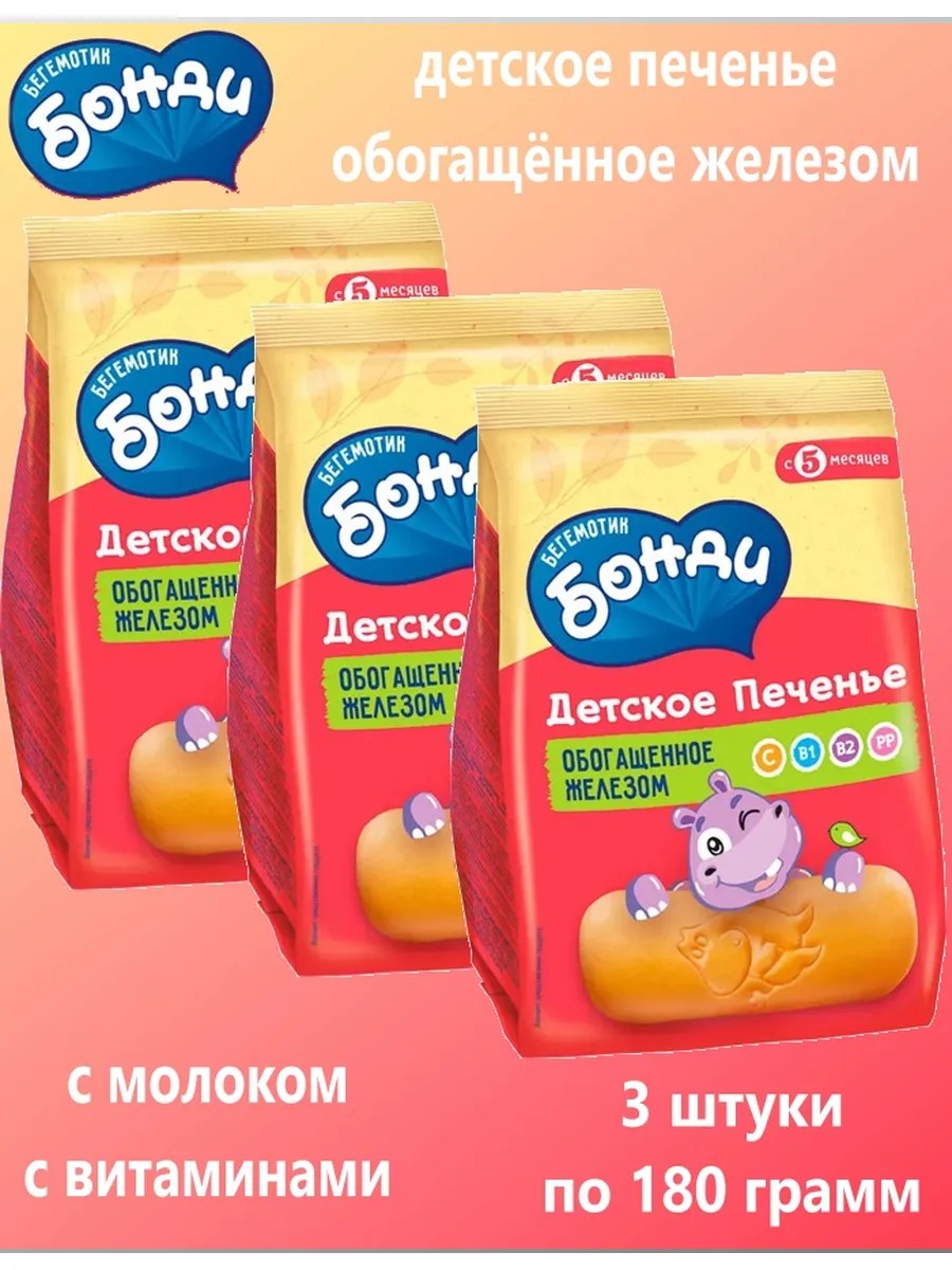 | Комплектация | Бегемотик Бонди – детское печенье обогащённое железом, 3×180 г |