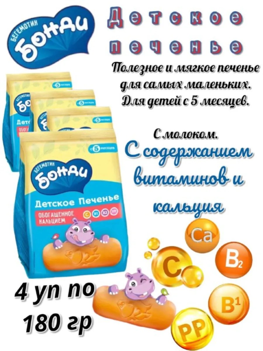 Бонди Бегемотик детское печенье с кальцием с 6 месяцев, 4 пачки по 180г