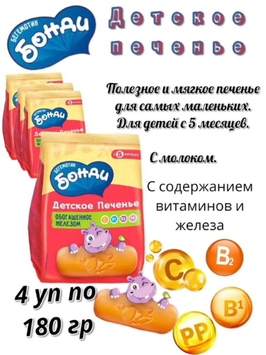 Бонди Бегемотик Печенье детское с железом с 6 месяцев, 4 пачки по 180г